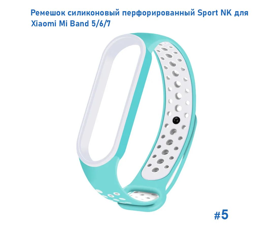 Ремешок силиконовый перфорированный Great Case Sport NK для Xiaomi Mi Band 5/6/7, 250мм, на кнопке, бирюзовый+белый (5)