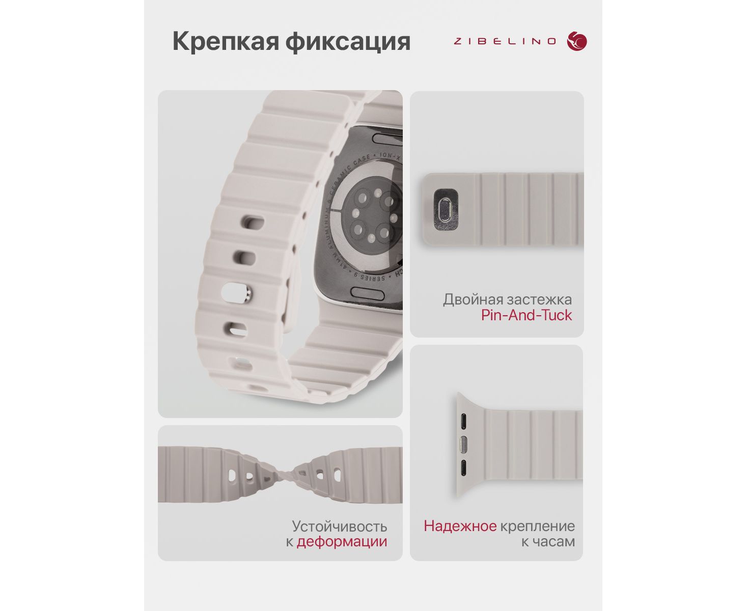 - Надежное крепление на руке: застежка pin-and-tuck (англ. «застежка-булавка») и магниты внутри ремня Эпл Вотч предотвращают расстегивание и обеспечивают идеальную посадку на запястье.