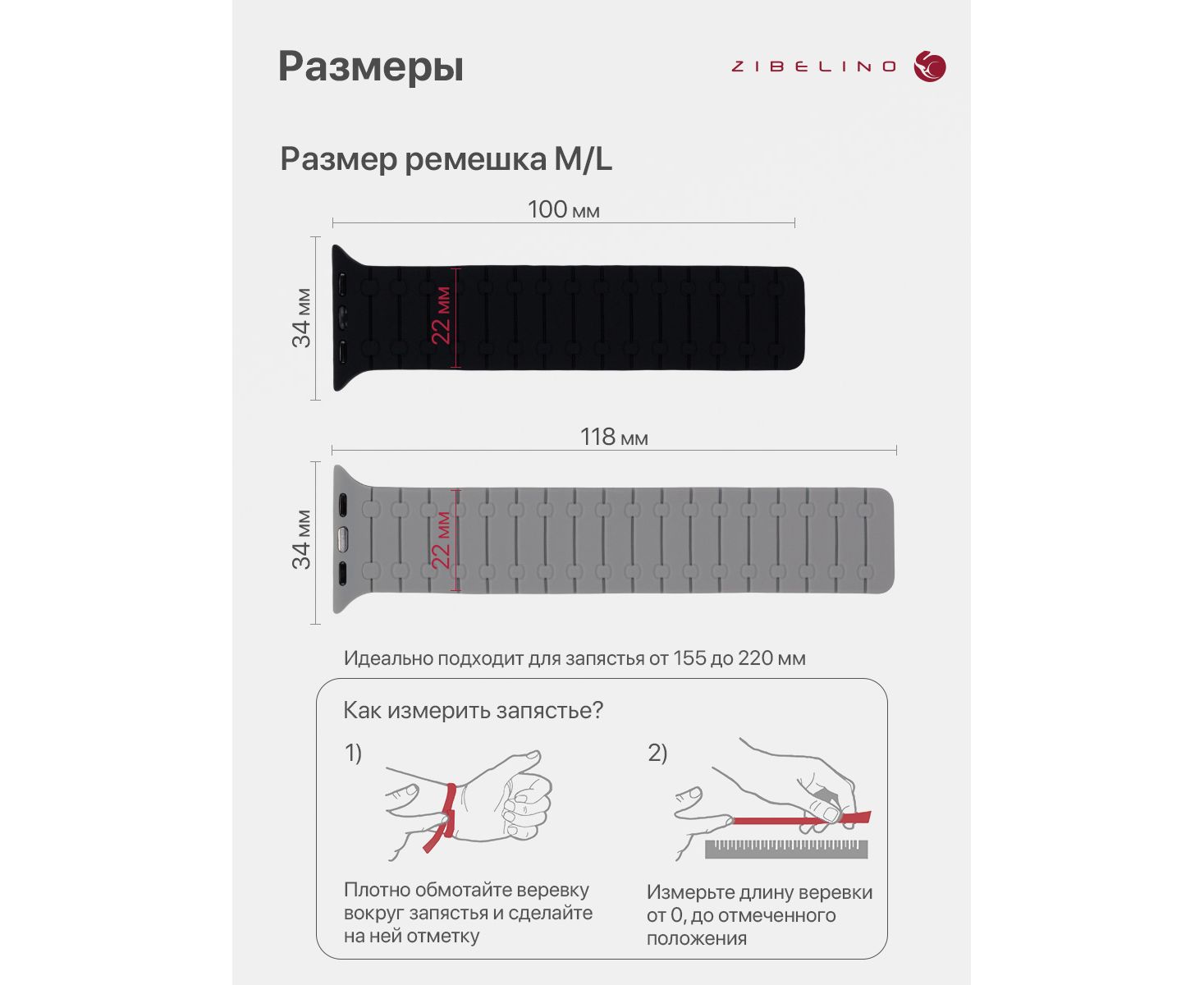 Ремешок размера M/L подходит для запястья обхватом от 15,5 до 22 см. Размер ремешка 218x22x2мм.