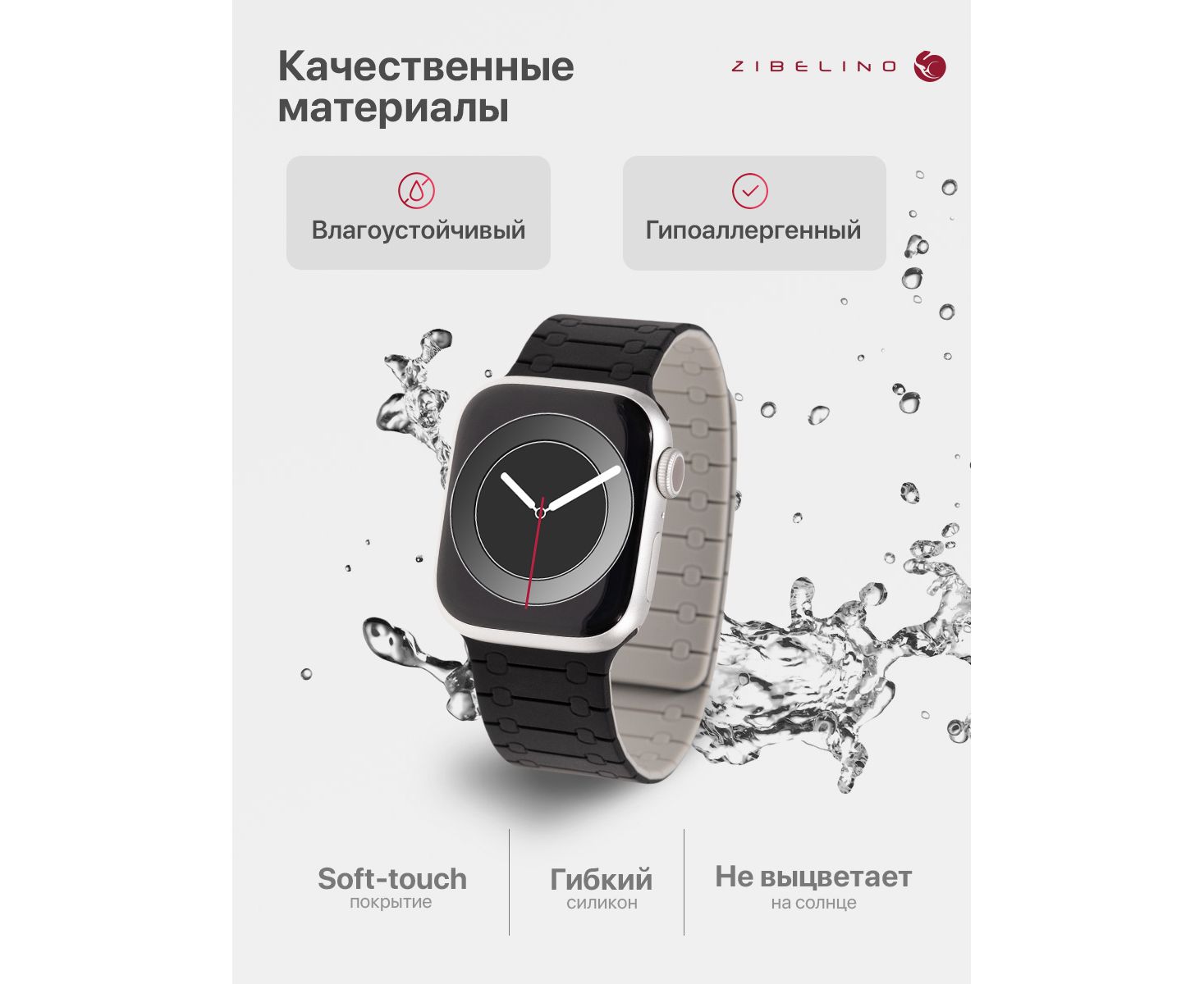 - Комфорт и гигиеничность: гипоаллергенный силикон браслета Apple Watch с soft touch покрытием мягкий, гладкий и приятный на ощупь. Не натирает кожу даже при длительном ношении.