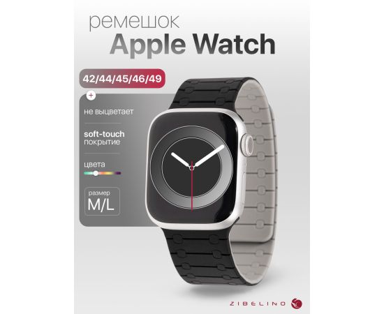Ремешок магнитный силиконовый для Apple Watch 42mm, 44mm 45mm, 46mm 49mm (размер M/L), черно-серый (Эпл Вотч 42 44 45 46 49 мм)