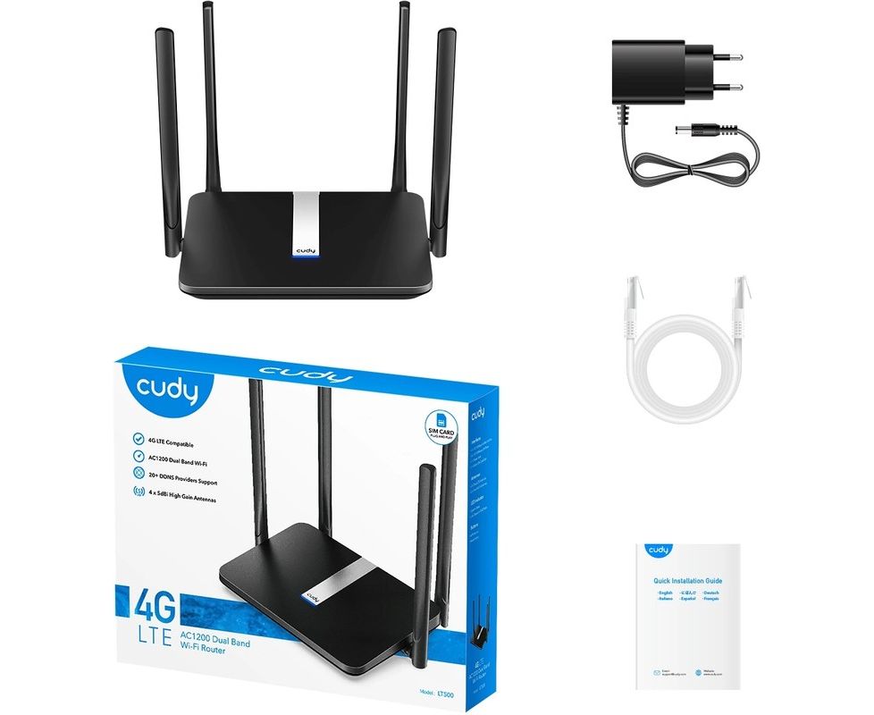 4G LTE WiFi роутер, адаптер питания, RJ45 Ethernet кабель, руководство быстрой установки.