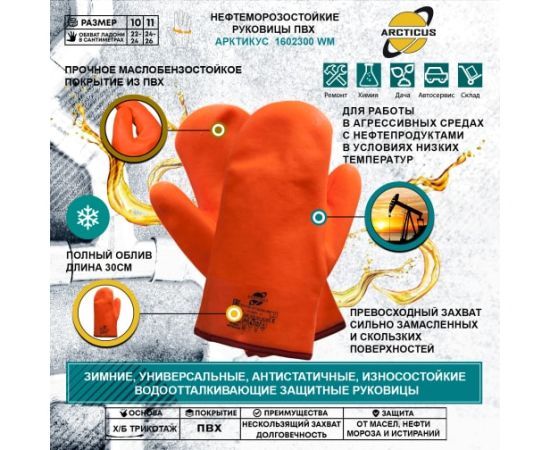 Технические характеристики трикотажных рукавиц ARCTICUS х/б с ПВХ, полное нефтеморозостойкое (НМС) покрытие, джерси, оранжевые 1602300 WM-111
