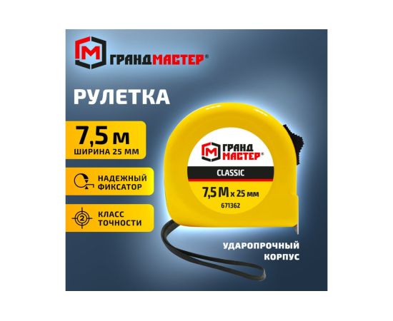 Рулетка измерительная ГРАНДМАСТЕР 671362 Classic 7,5м*25мм, пластиковый корпус, с фиксатором