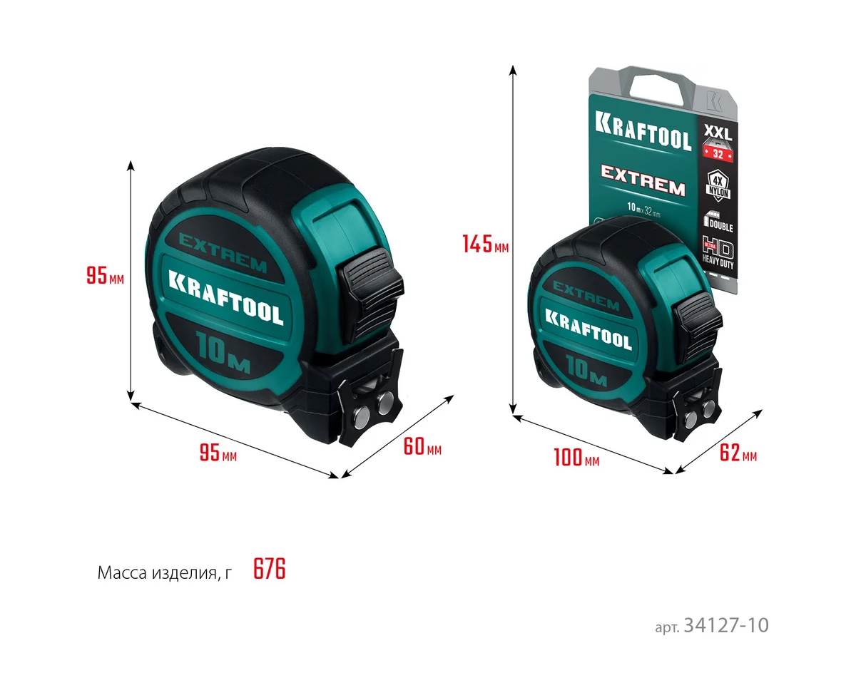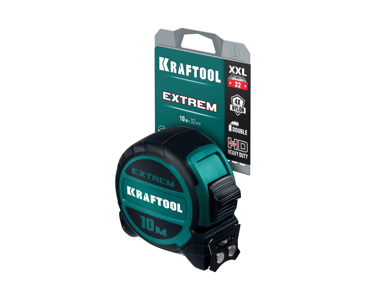 Рулетка со сверх широким полотном 10 м х 32 мм KRAFTOOL Extrem 34127-10 - мощная профессиональная рулетка со сверхшироким полотном и особопрочным нейлоновым покрытием полотна X-SAFE. Применяется для измерения линейных размеров путем непосредственного сравнения со шкалой.