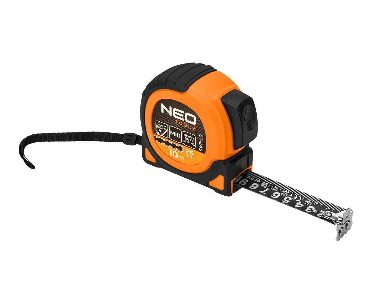 Рулетка NEO TOOLS Super Black 67-245 стальная 10 мx25 мм, автоматическая блокировка, две кнопки остановки, магнит
