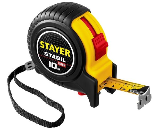 Профессиональная рулетка с двухсторонней шкалой STAYER Stabil 10мх25мм 34131-10_z02 с нейлоновом покрытием полотна, увеличивающее срок службы, магнитным крюком и дополнительным фиксатором для дополнительного удобства работы.