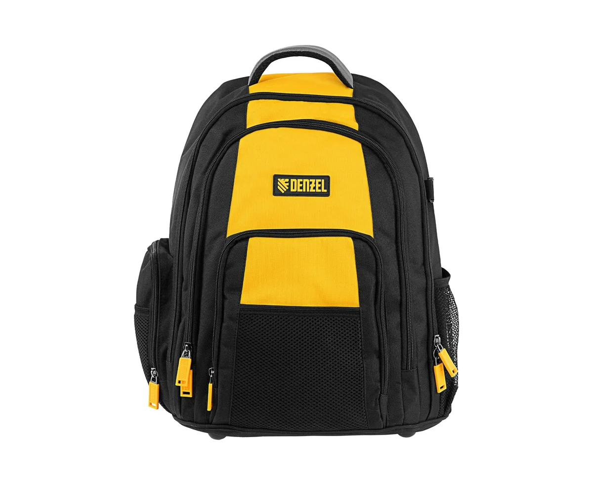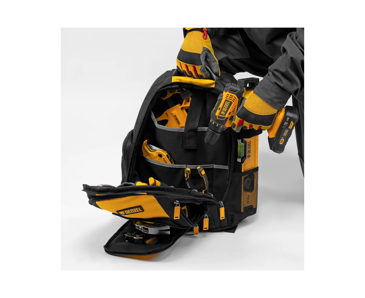 Рюкзак Denzel 90296 размером 365 х 190 х 430 мм, с 3 отделениями и 26 карманами (в том числе сетчатыми), предназначен для размещения и транспортировки ручного инструмента. 3 секции позволяют организовать упорядоченное хранение всех необходимых предметов. Рюкзак пригодится выездному мастеру.