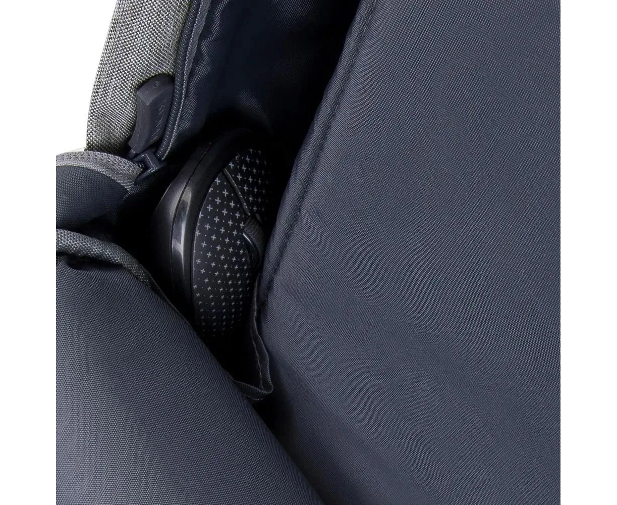 Просторное основное отделение имеет карман на молнии для паспорта и бумажника и два кармана на дне рюкзака - один для мыши, второй для повербанка. На боковой стороне рюкзака имеется USB-порт для подключения портативного внешнего аккумулятора к смартфону.