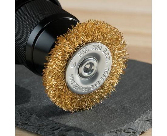 Щетка дисковая прямая для дрели Deli DH-GSS050-E4 50мм, латунированная, толщина проволоки 0,3мм, хвостовик 6мм, макс 4500об/мин