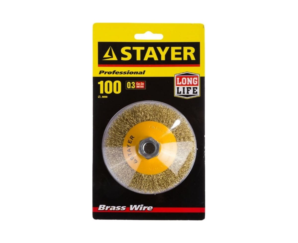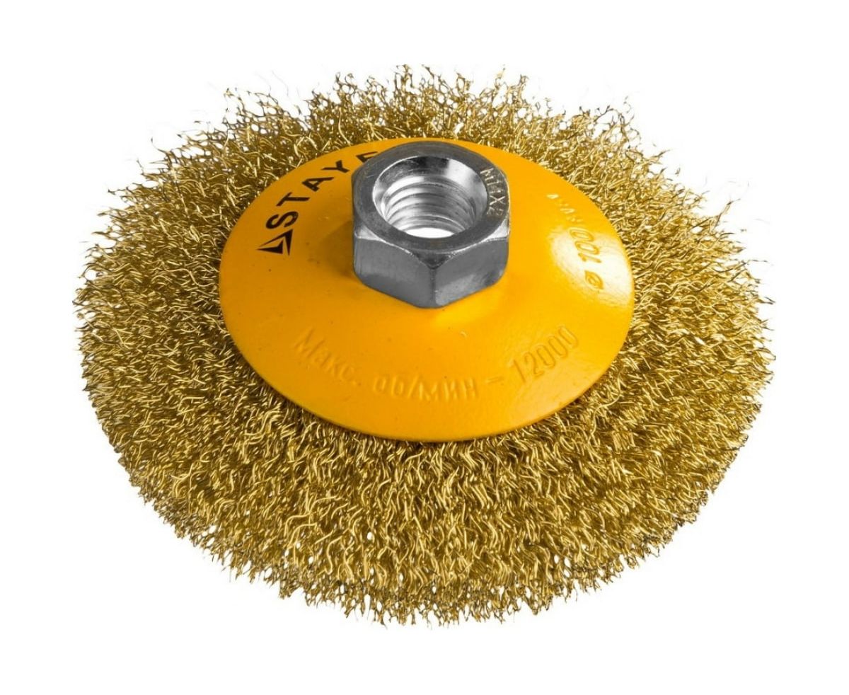 Щетка коническая STAYER Professional 35133-100 с посадочным М14, витая латунированная стальная проволока 0.3мм, d-100мм