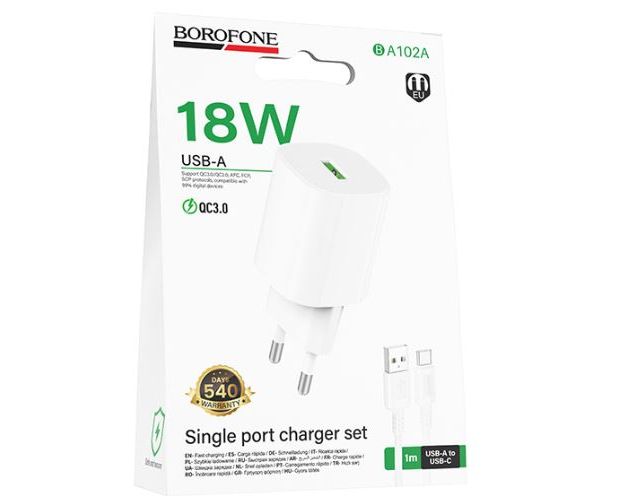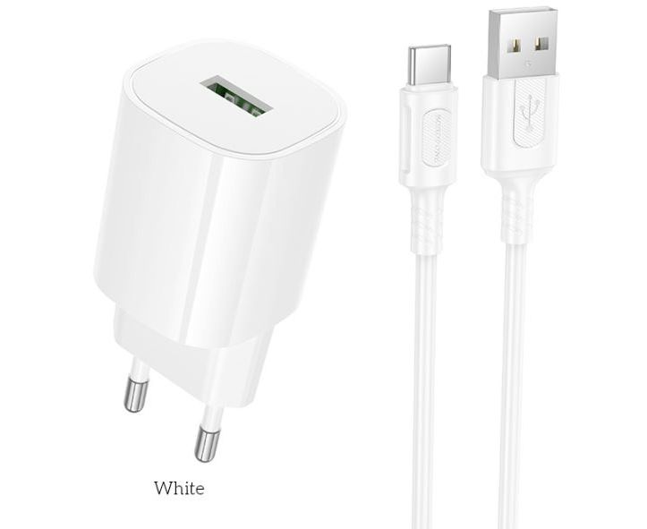 Сетевое зарядное устройство BOROFONE BA102A/ + Кабель Type-C 1m/ QC 3.0/ 1 USB/ Выход: 18W/ Белый