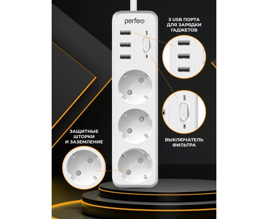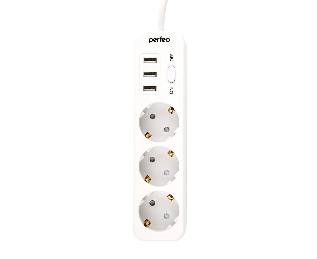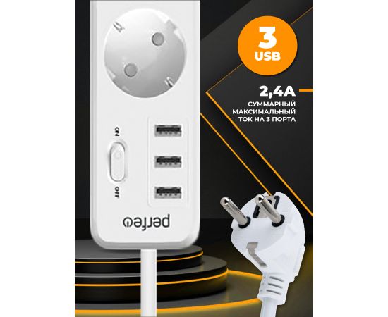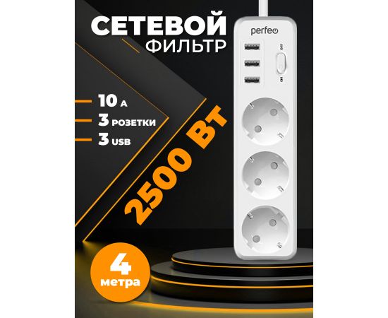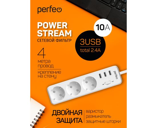 Сетевой фильтр Perfeo "POWER STREAM", 2500W, двойная защита, 4м, 3 розетки, 3 USB, белый.