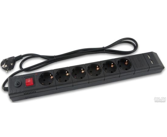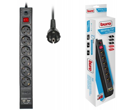 Сетевой фильтр Buro BU-SP1.8_USB_2A-B 1.8м (6 розеток) черный