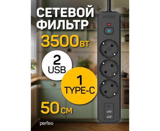 Сетевой фильтр Perfeo "REAL HOME" 0,5м, 3 розетки, 2USB+1TYPE-C, 16А, 3500 Вт,тройная защита,черный.