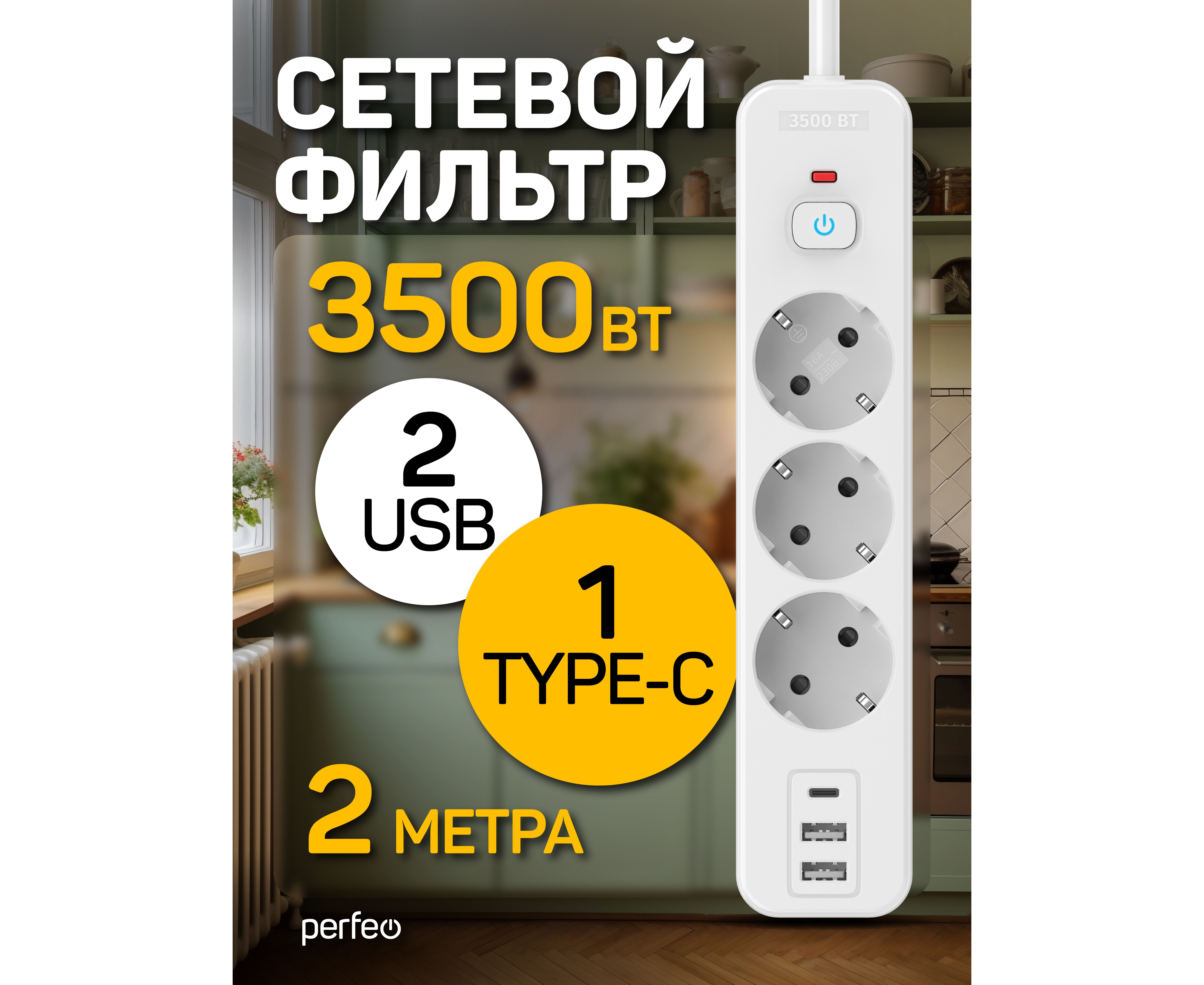 Сетевой фильтр Perfeo "REAL HOME" 2,0м, 3 розетки, 2USB+1TYPE-C, 16А, 3500 Вт,тройная защита,белый.