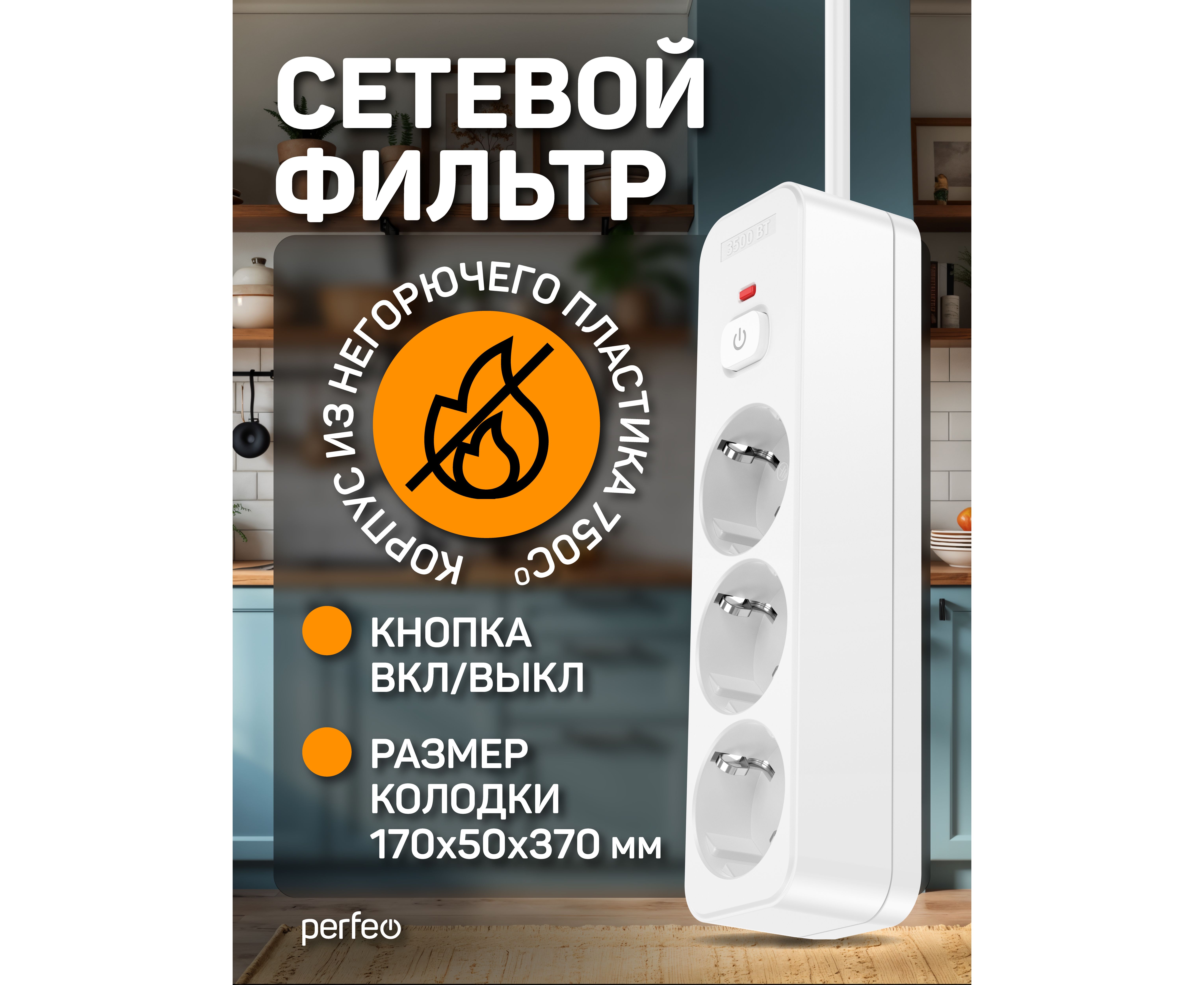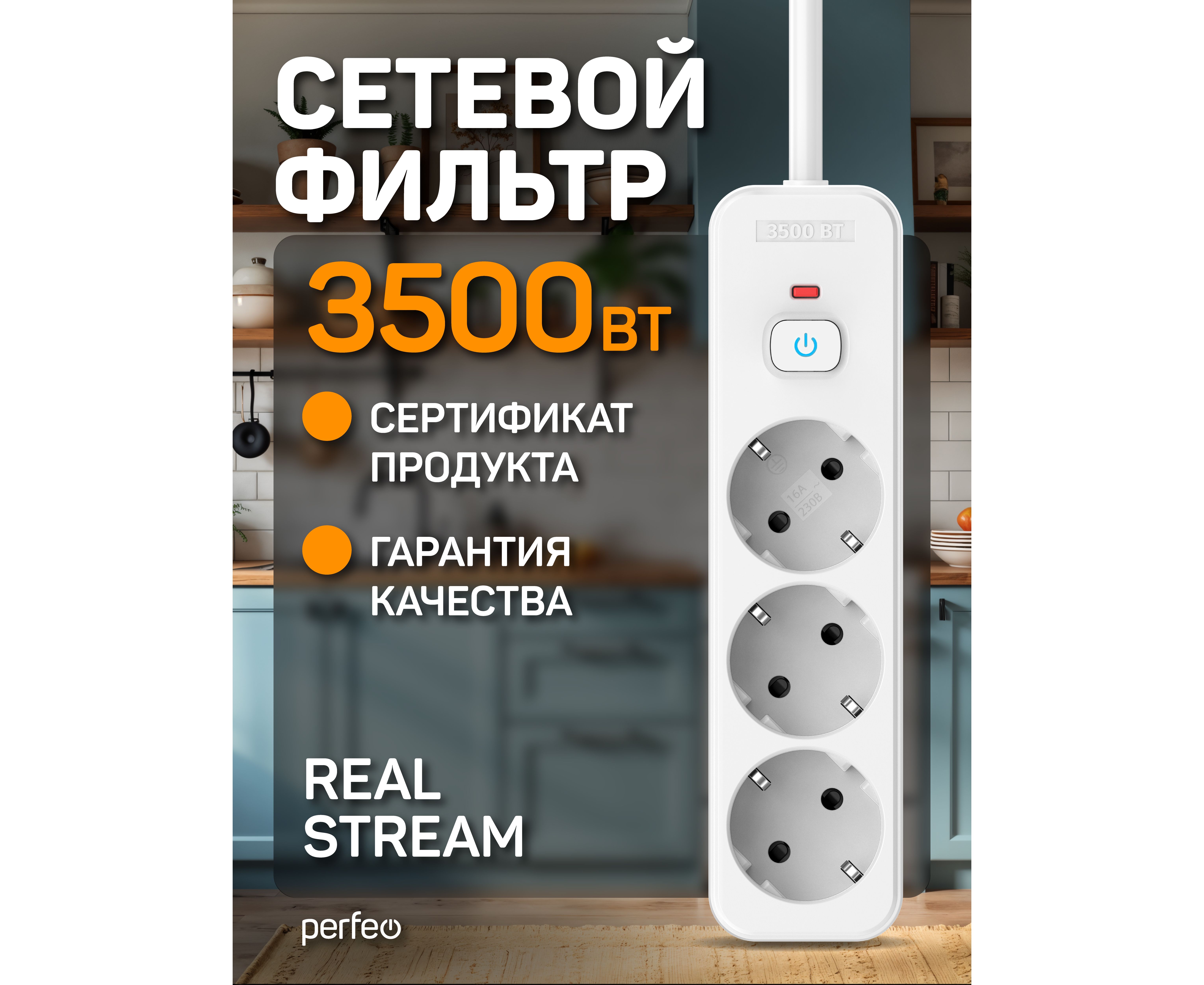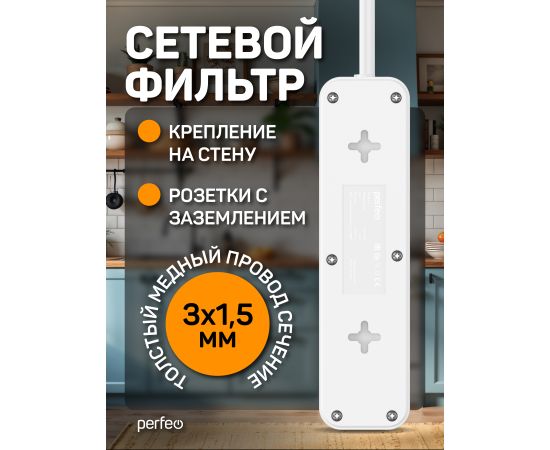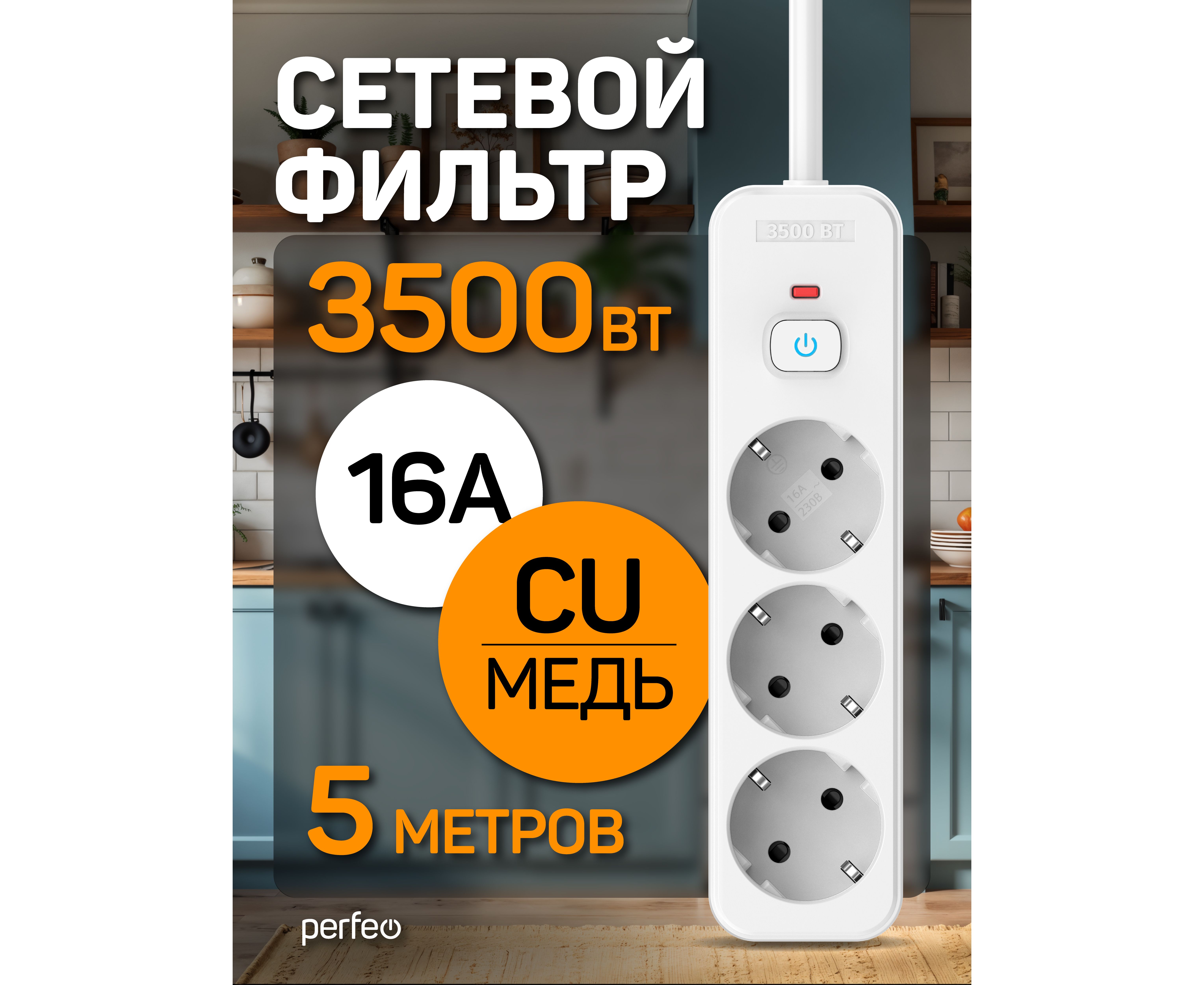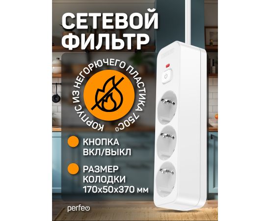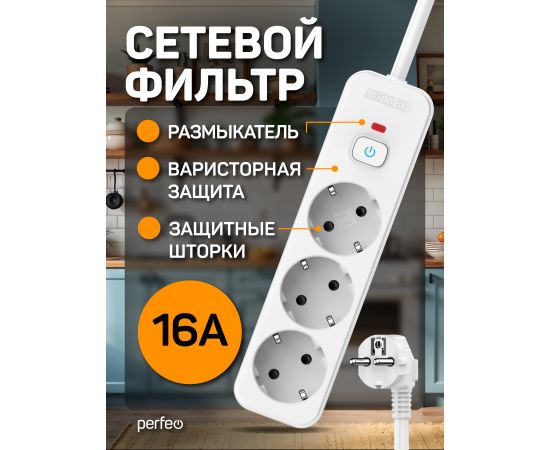 Сетевой фильтр Perfeo "REAL HOME" 5,0м, 3 розетки, 16А, 3500 Вт, тройная защита, белый.