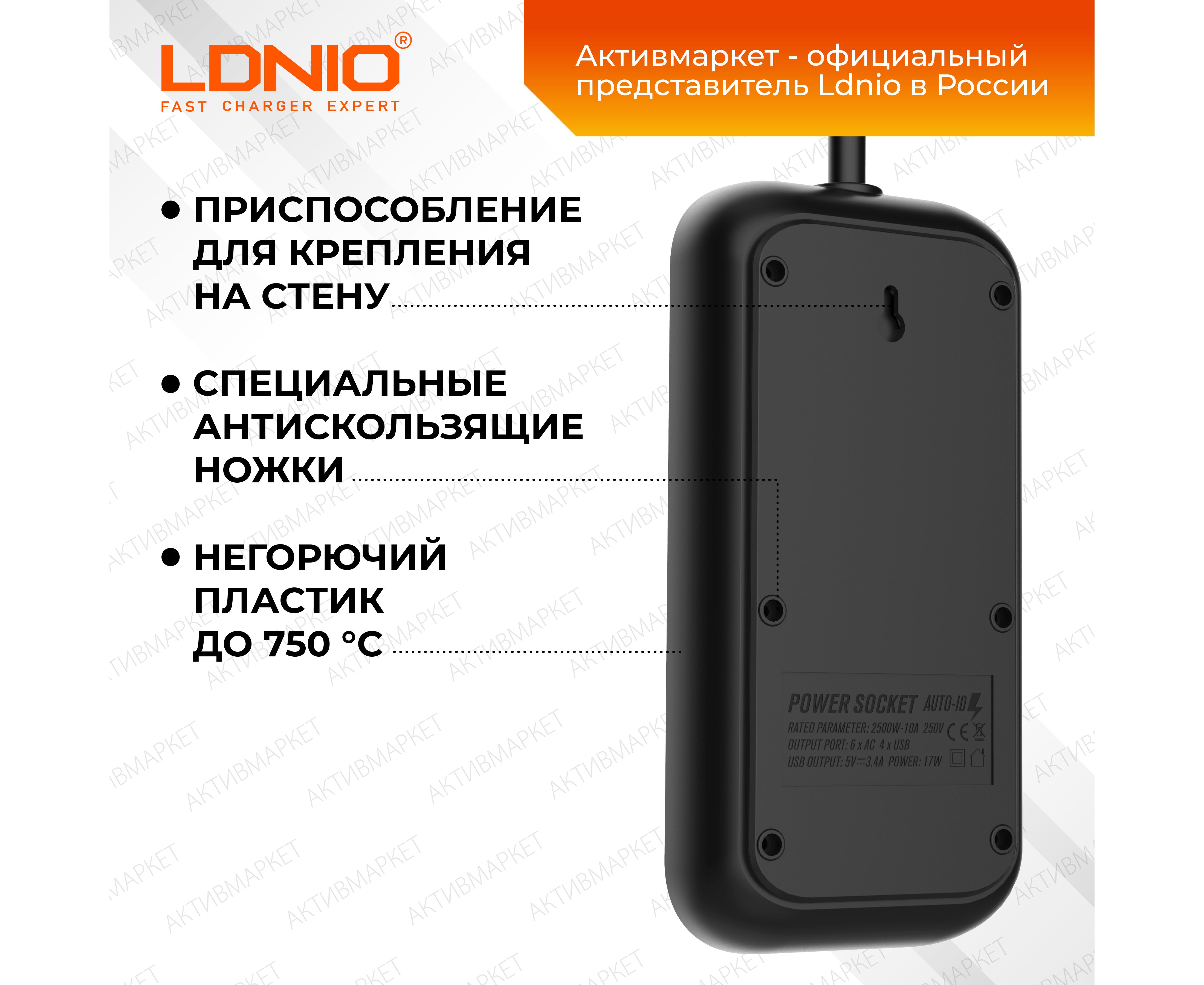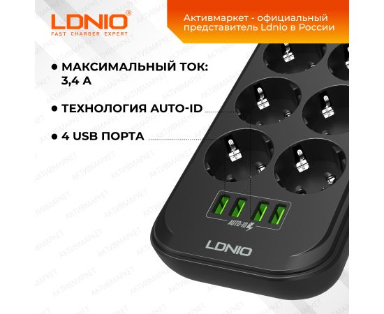 Обратите пожалуйста внимание - эта модель представлена в разных комплектациях - вы можете выбрать длину шнура, мощность, наличие защиты. Данная модель - сетевой удлинитель с функцией умной зарядки Ldnio SE6403 на 6 розеток и 4 USB порта с защитой от перегрузки, короткого замыкания и перегрева. Максимальная мощность подключаемых устройств – 2500 Вт. Удлинитель имеет провод длиной 2 метра, встроенную варисторную защиту от высоковольтных импульсов в сети, единый выключатель, что позволяет удобно регулировать подключенные устройства.. Этот умный тройник с 6 электрическими розетками позволяет подключать не только компьютер и ноутбук, но также и другую технику и аксессуары. Все розетки оснащены специальными защитными шторками от детей – вы можете быть уверены, что никакие посторонние предметы не коснутся контакта под напряжением. 4 USB разъема обеспечивают зарядку электронных гаджетов таких, как телефоны, планшеты, наушники и многие другие. Уникальная технология Auto-ID для USB портов автоматически определяет подключенное устройство и заряжает его максимальным током. В отличие от многих других сетевых фильтров, предлагаемых на рынке, продукция Ldnio изготавливается из специального негорючего пластика, который сохраняет пожаробезопасность до температуры 750 градусов С. Выключатель устройства помогает экономить электроэнергию, а противоскользящие ножки обеспечивают надежность и безопасность при использовании. Благодаря элегантному дизайну и компактным размерам, он легко помещается в любом месте дома и можно использовать как в стационарном положении, так и в путешествиях или командировках.