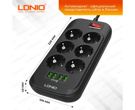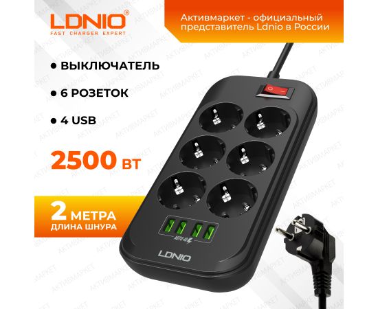 Сетевой удлинитель LDNIO SE6403 / 2м + ЗУ на 4 USB/ 6 розеток (медь) - 2500W/ USB - 17W/ Черный, (Арт. LD_B4436)