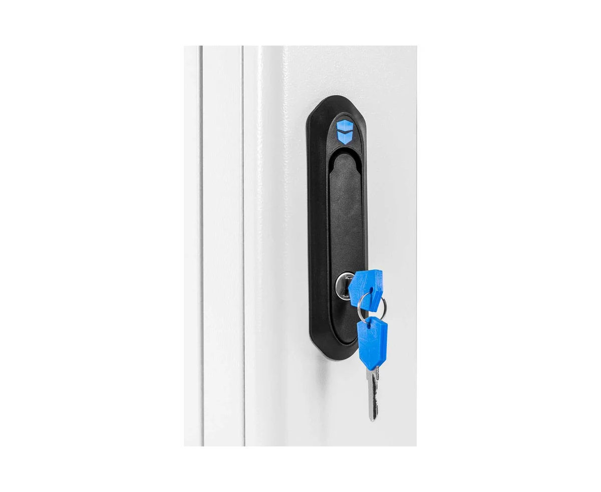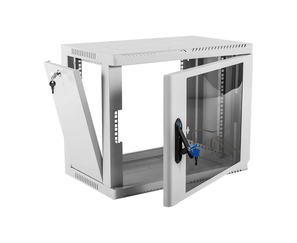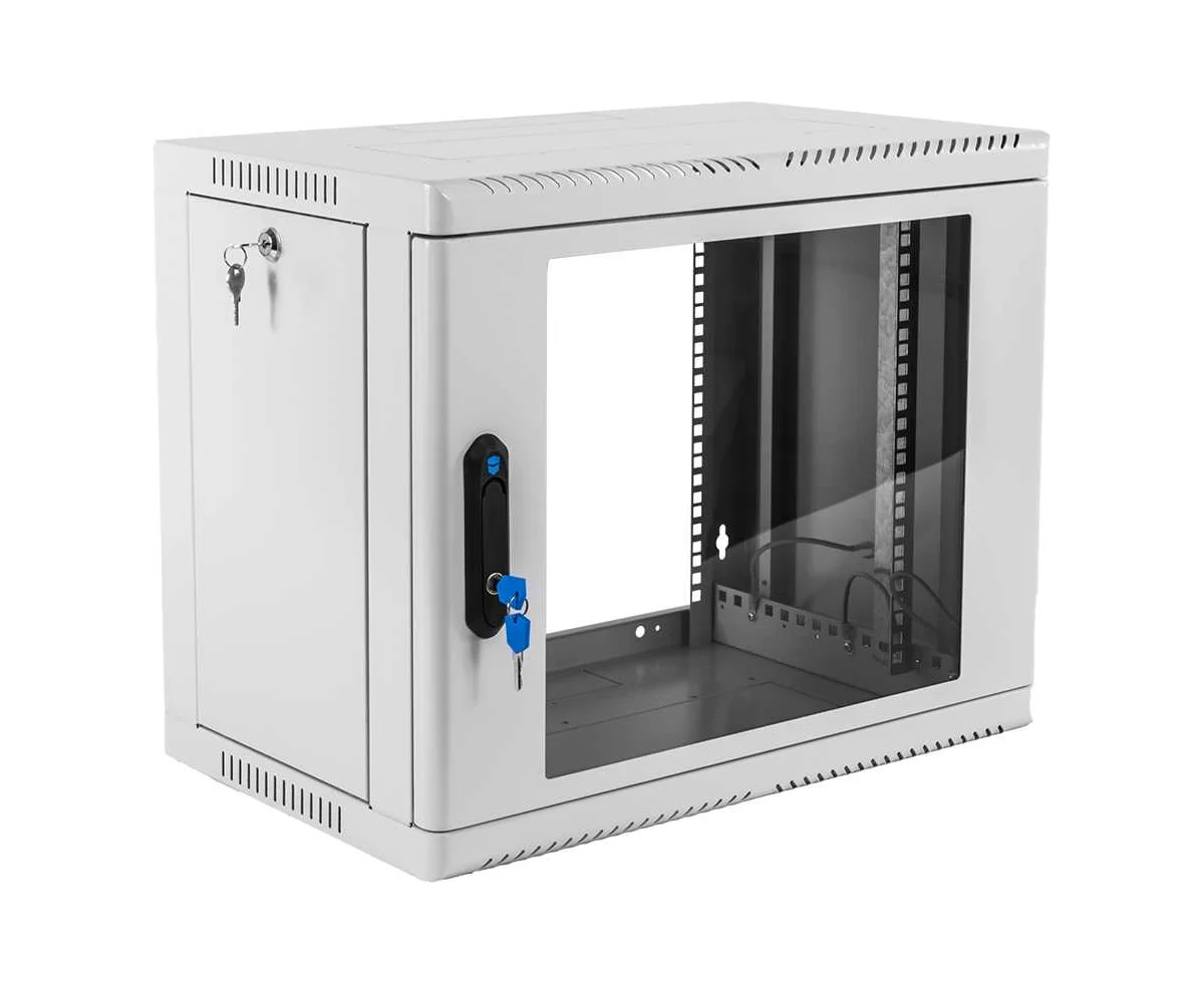 Настенный шкаф 19" ШРН имеет цельнометаллическую сварную конструкцию, он удобен для быстрой установки и монтажа оборудования, так как не требует сборки. Отсутствие острых углов с фронтальной стороны повышают безопасность при эксплуатации и обслуживании шкафов, что помогает исключить человеческие травмы при соприкосновении со шкафом. Комплектация дверью с тонированным ударопрочным стеклом. Новая конструкция стеклянной двери с механическим креплением стекла увеличивает её жесткость, и обеспечивает легкую замену стекла при его повреждении. Возможна установка двери, как с правой, так и с левой стороны. Новый усиленный точечный замок с поворотной ручкой увеличивает жесткость фиксации двери в закрытом положении и защиту от несанкционированного доступа, а также обеспечивает удобство при её открывании.