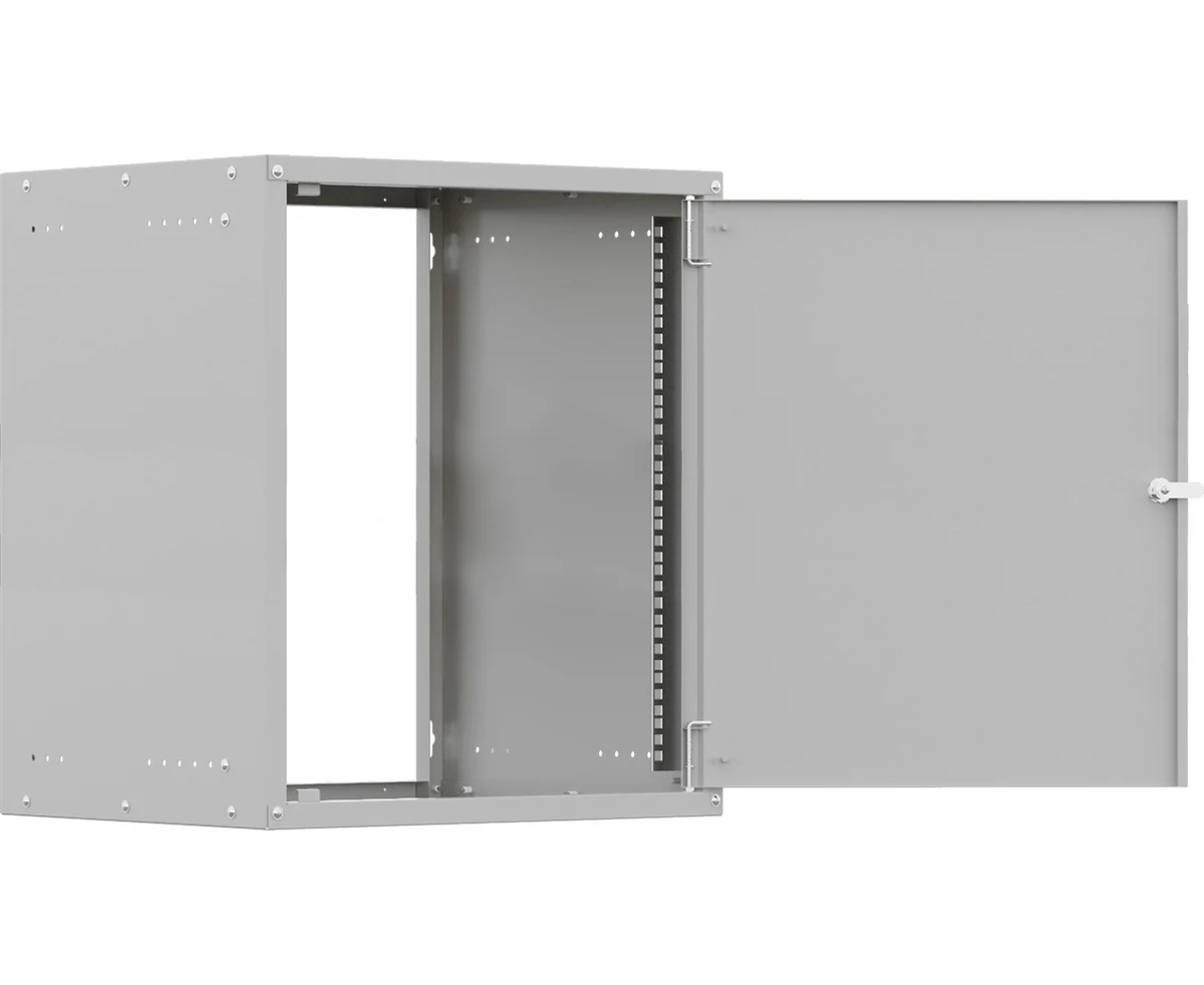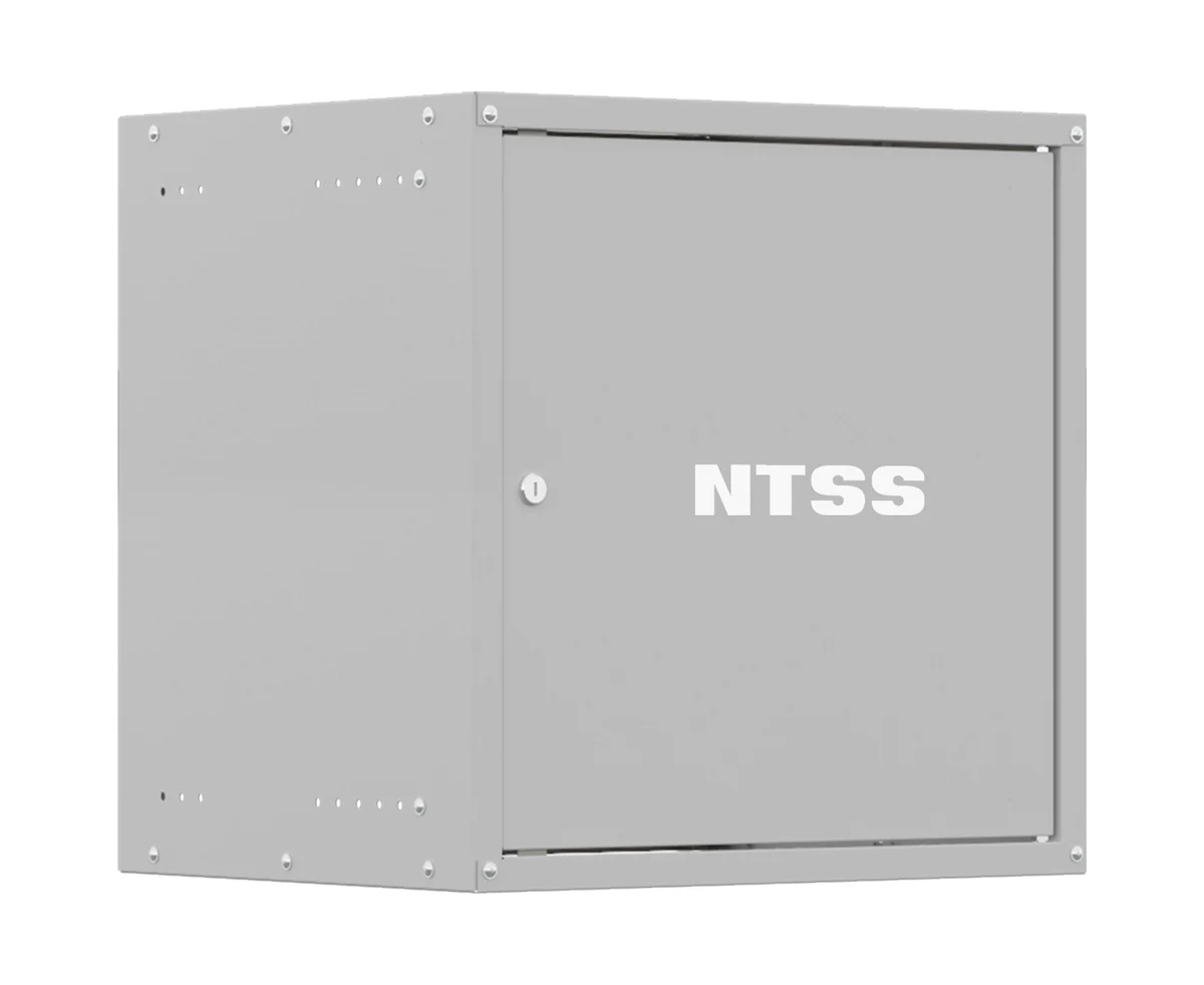 Компактный разобранный настенный шкаф NTSS серии «W» с передней дверью, открываемыми боковыми стенками на защелках, задней стенкой и панелями пола и потолка. В комплекте 1 пара 19” профилей, уголки для поддержки оборудования.