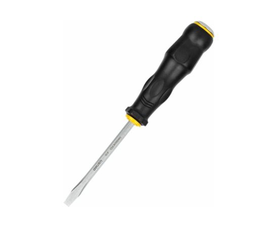 Ударная шлицевая отвертка используется для работ с резьбовыми соединениями в процессе ремонта или монтажа. Металлический затыльник рукоятки позволяет использовать инструмент вместе с молотком в процессе откручивания сложных винтов и гаек. Стержень выполнен из качественной хромованадиевой стали, что обеспечивает высокую антикоррозийную стойкость и долговечность.