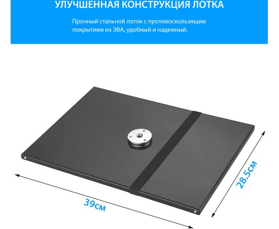 Размеры столика штатива составляют 380 х 280 см, что обеспечивает достаточное пространство для установки устройства подходящего размера. Материал ножек – алюминий, что не только говорит о прочности изделия, но и придает ему элегантный и стильный вид.
