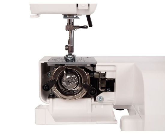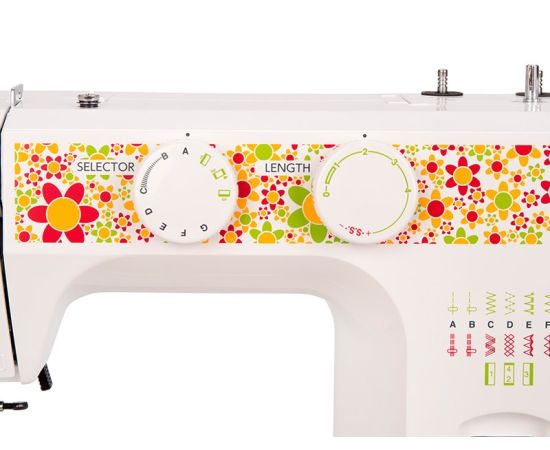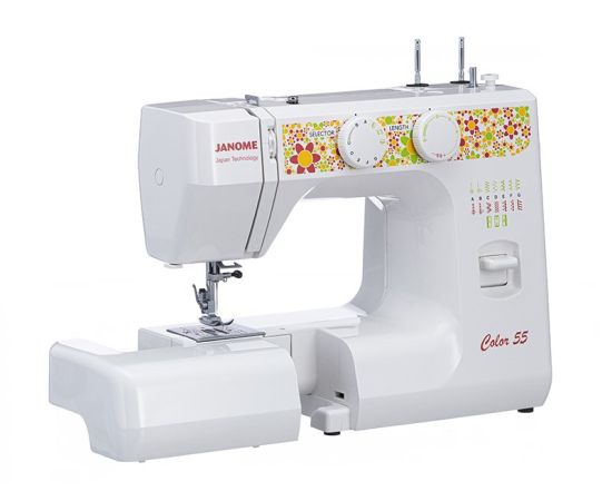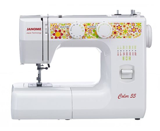 Электромеханическая швейная машина Janome Color 55 имеет все основные швейные операции: рабочие, трикотажные, оверлочные, потайные, а также декоративные строчки. Петля выполняется в полуавтоматическом режиме. Janome Color 55 имеет съёмную рукавную панель, которая позволяет без проблем шить узкие изделия, такие как манжеты рукавов, брючины и детские вещи. Это простая в управлении швейная машина подойдёт и новичкам, и тем, кто уже умеет неплохо шить.