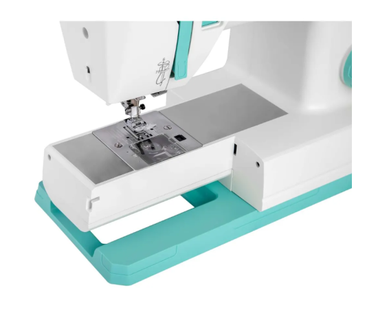 Пластиковый бирюзовый корпус размещает катушку в горизонтальной плоскости, отсек для аксессуаров, механизм вдевания нити, ручку для переноски, прорезиненные ножки педали. Электропитание происходит через отсоединяемый шнур 1,4 м, потребляемая мощность составляет 90 Вт. В комплекте идут вспарыватель, комплект игл, направитель материи, отвертка, щетка для чистки, чехол. Общая масса — 7,4 кг. Габариты: 30х40х17 см.