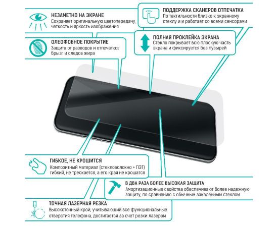 ГИБРИДНОЕ защитное стекло для экрана и камеры телефона сохраняет гибкость защитной пленки, и прочность стекла. Оно намного удобнее обычного закаленного стекла - как при транспортировке, так и при установке. Гибридное стекло тоньше, прочнее и надежно защищает смартфон от повреждений. Имеет отступы по 1 мм от края дисплея для удобства ношения защитного чехла. Оно имеет высокую степень устойчивости к царапинам, обеспечивает хорошую чувствительность к касанию и не влияет на сенсорный отклик по всей поверхности дисплея. Идеально прозрачное, не снижает четкость и яркость изображения, не меняет оригинальную цветопередачу. Изготовлено из гибкого композиционного материала (стекловолокно и ПЭТ). Верхний слой из стекловолокна по тактильным ощущениям близок к стеклу и не влияет на работу сенсора по всей поверхности экрана. Гибридное стекло гибкое, оно не растрескивается и не крошится, как обычное закаленное стекло. Защищает от пыли, грязи, брызг и царапин. Полная проклейка поверхности (Full Glue). Специальная смесь высококачественных клеев гарантирует установку без пузырьков воздуха и что стекло не отслоится с течением времени. Внимание! Гибридное стекло поставляется в двух защитных транспортировочных пленках (на тыльной и лицевой стороне). Данные пленки могут быть поцарапаны. После наклеивания стекла снимите защитную синюю пленку "2" с лицевой стороны!
