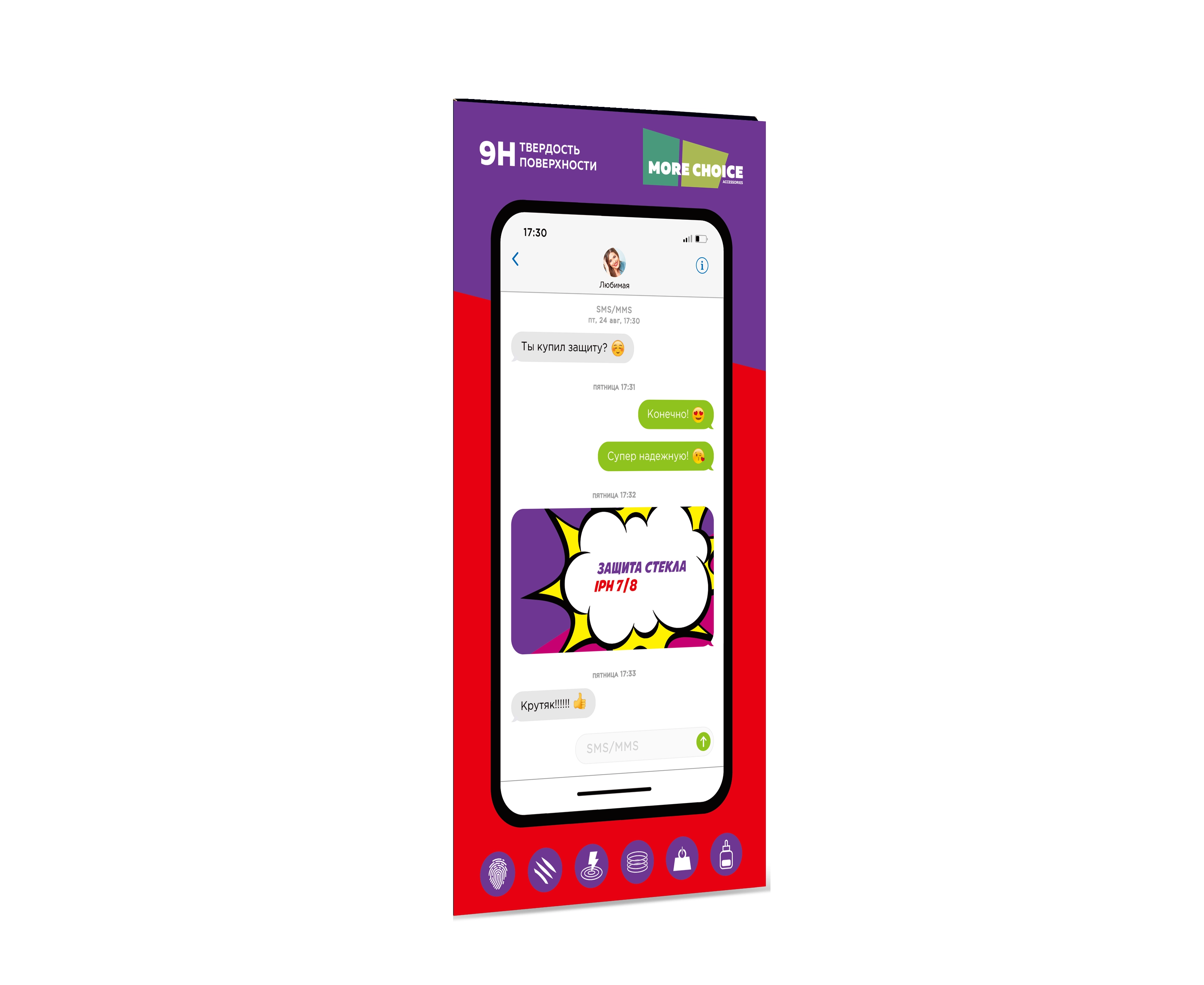 More choice - настоящий друг и товарищ для вашего iPhone. Закалённое стекло премиального качества отлично защитит дисплей смартфона от царапин и даже повреждений при падении. Стекло ультратонкое, поэтому вы даже не почувствуете его присутствие на смартфоне. Также стекло совершенно не искажает HD изображение на экране и не препятствует отклику сенсора.