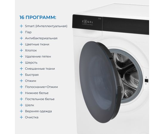 16 программ: Smart (Интеллектуальная)/Пар/Антибактериальная/Цветные ткани/Хлопок/Удаление пятен/Шерсть/Смешанные ткани/Быстрая/Отжим/Полоскание+Отжим/Нижнее белье/Постельное белье/Шелк/Верхняя одежда/Очистка