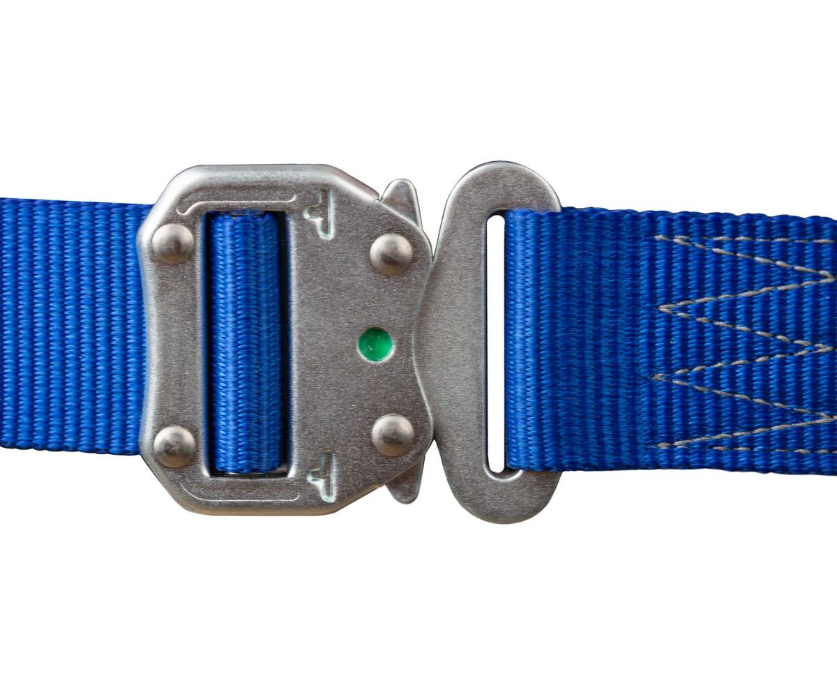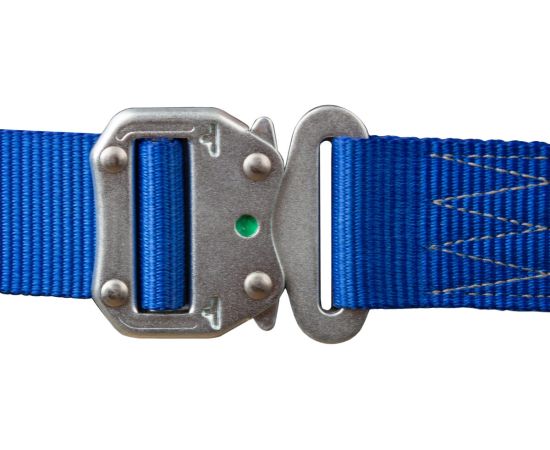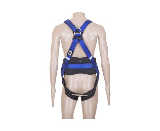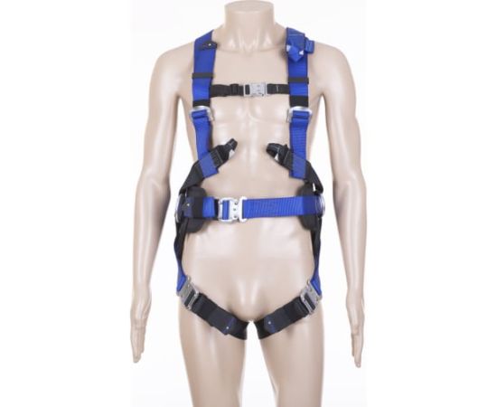Автоматические пряжки КЛИК позволяют быстро одеть привязь. Для идентификации верха и низа привязи лямки имеют разные цвета (синий, черный). X-образная пластина на спине, предотвращающая наплечные лямки от сдвига и удушения пользователя в случае срыва.