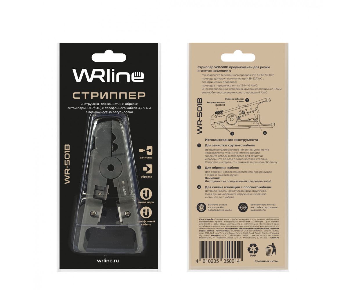 Стриппер Hyperline WRline WR-501B для зачистки и обрезки витой пары (UTP/STP) и телефонного кабеля 3,2-9 мм, с возможностью регулир