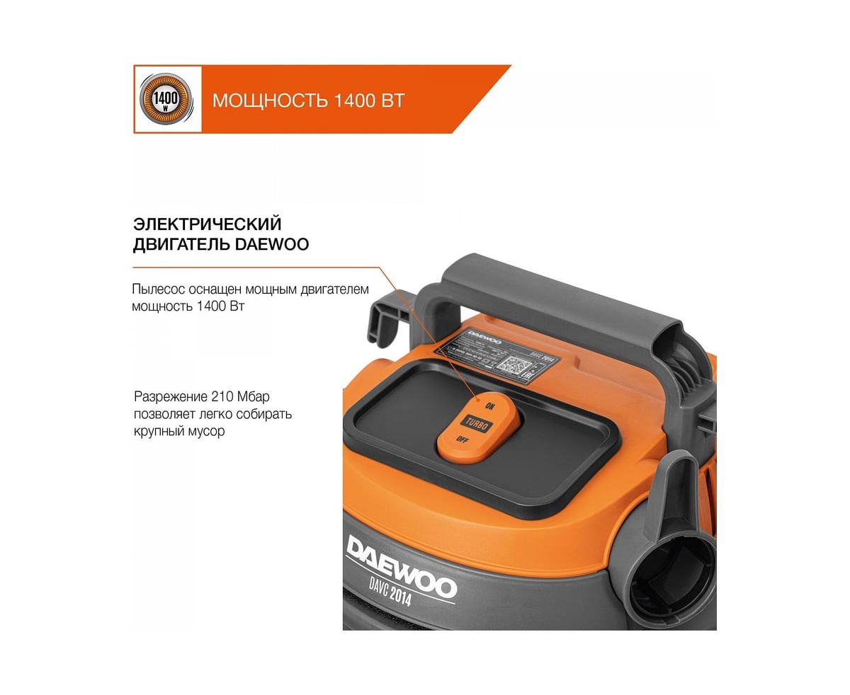 Строительный пылесос Daewoo DAVC 2014 1400Вт (уборка: сухая/сбор воды/выдув) оранжевый