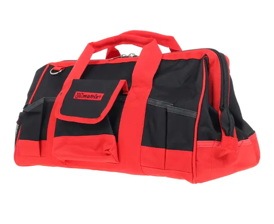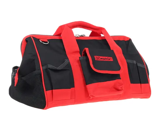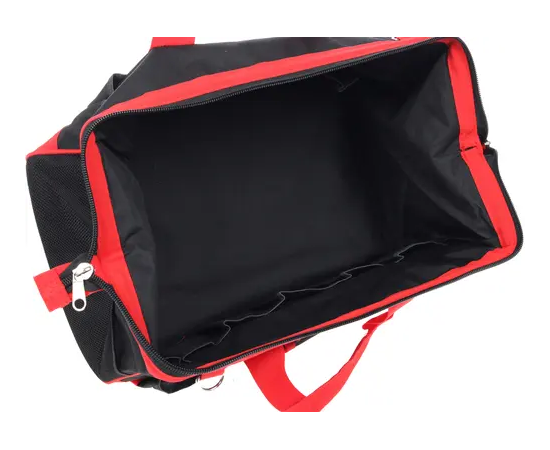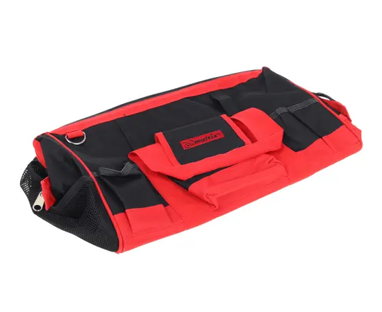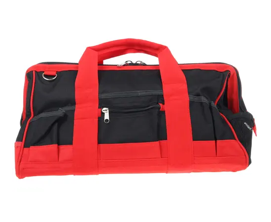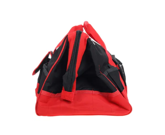 Сумка для инструмента сшита из плотного нейлона красного и черного цветов и рассчитана на переноску ручного и механизированного инструмента вместе с аксессуарами и рабочими принадлежностями.