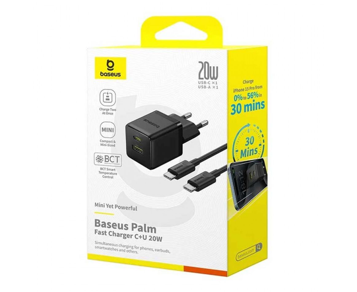 СЗУ BASEUS P10111608113-01 Palm Fast Charger C+U 20W EU With Baseus Mini White Cable USB-C to USB-C 60W (20v/3A) 1m Cluster Black
