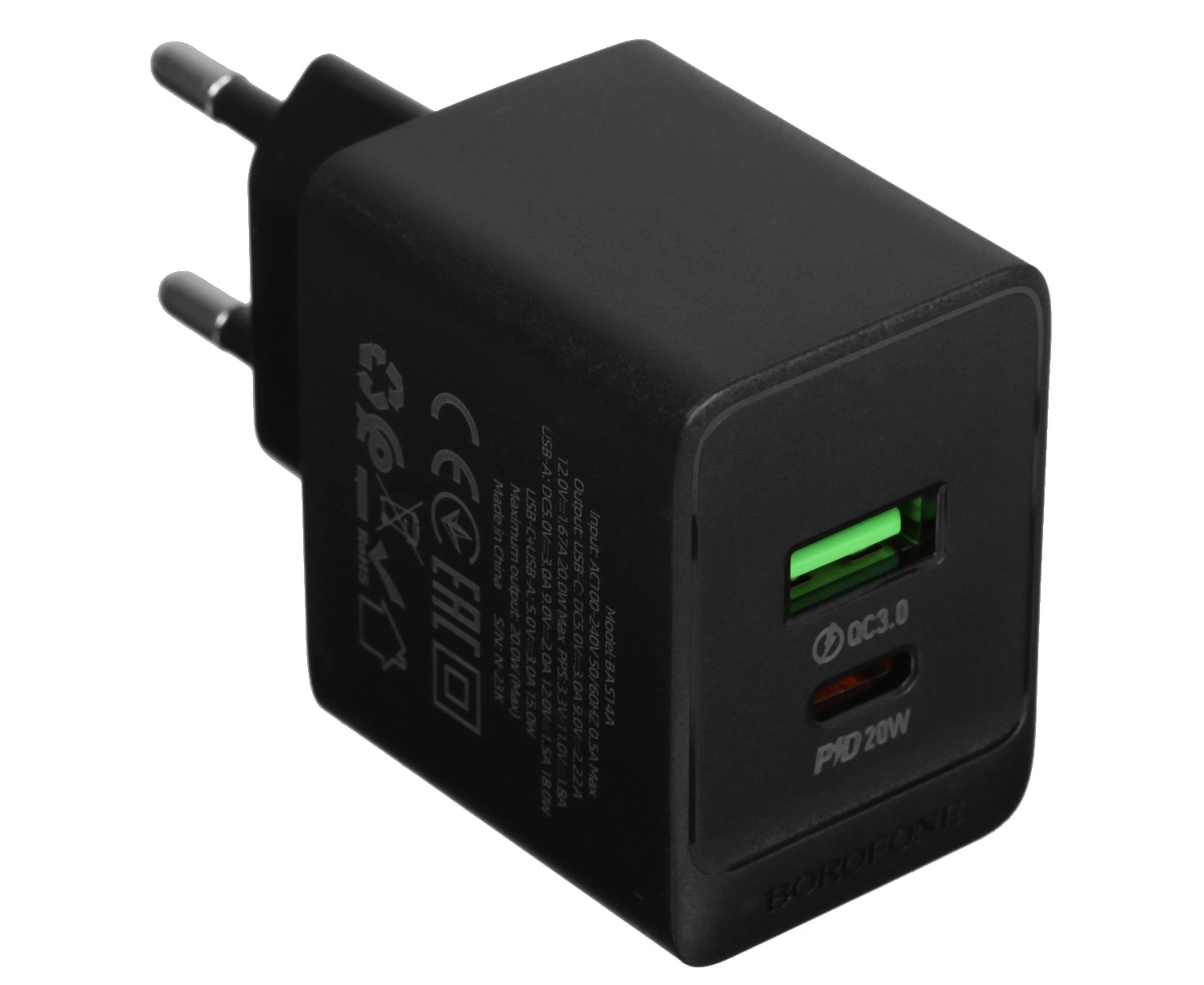 СЗУ Borofone BAS14A 1USB+1Type-C 3.0A QC3.0 PD 20W быстрая зарядка Black