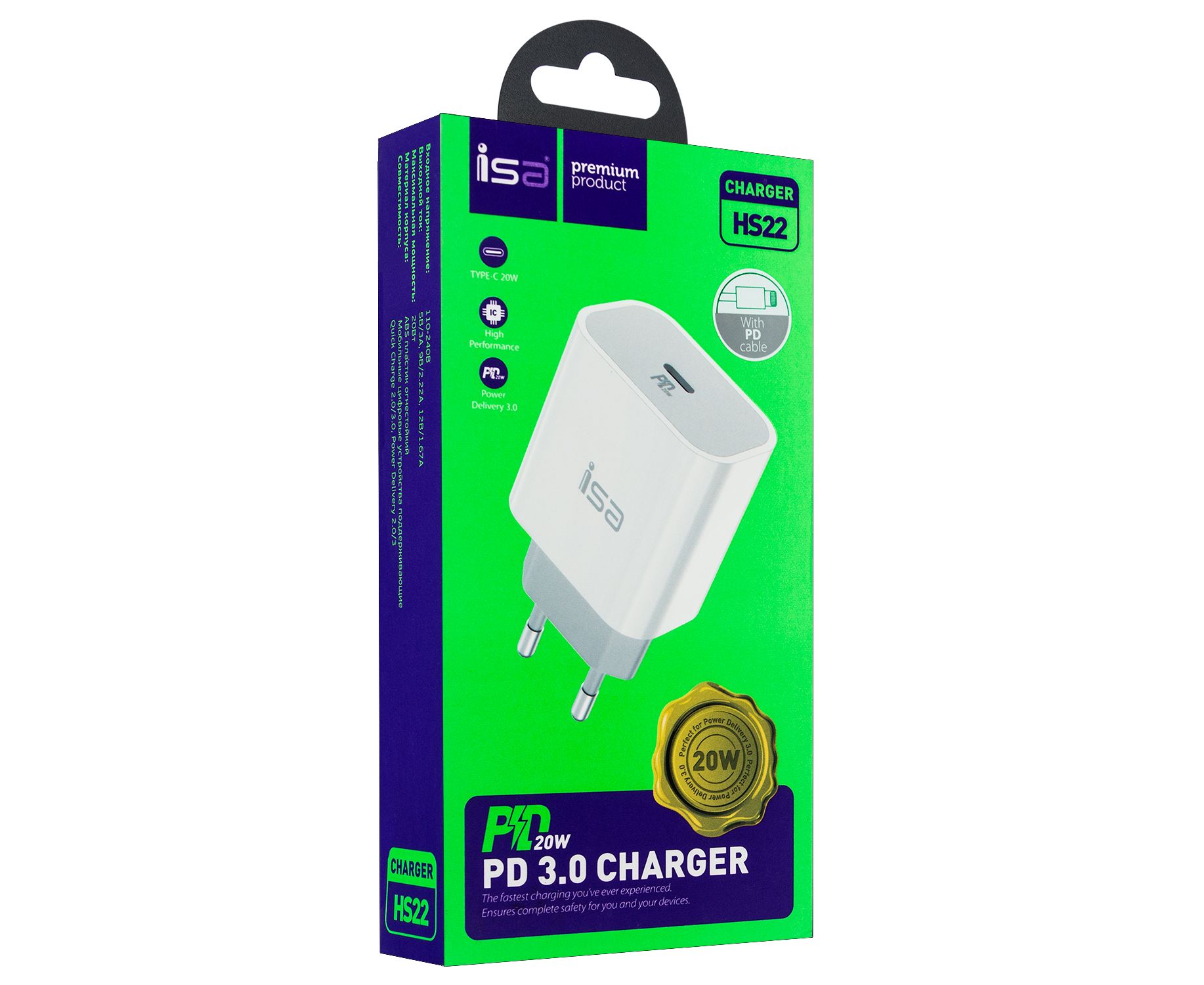 СЗУ Type-C + кабель Type-C to Lightning PD20W ISA HS22 (White)