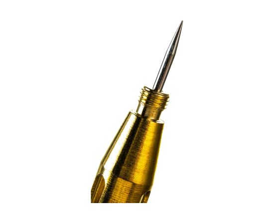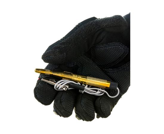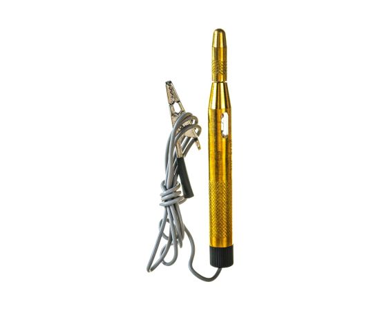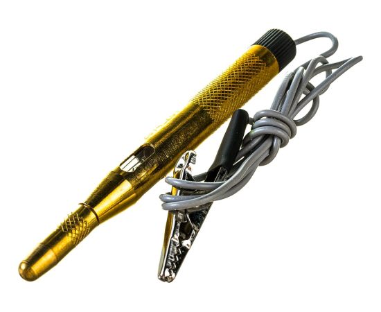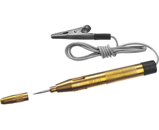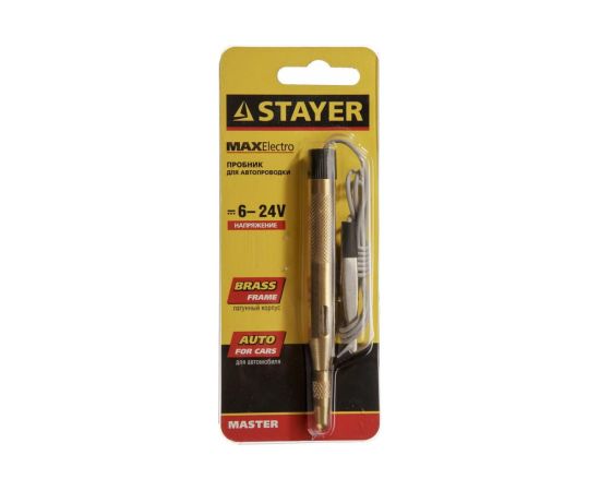 Пробник STAYER MAXElectro для автопроводки, латунный, 6-24В, 110мм 2574_z01 используется для прозвона проводки, контроля напряжения бортовой сети автомобиля, поиска неисправностей различного электрооборудования путем определения наличия напряжения в проводниках. При обнаружении напряжения в сети в диапазоне 6-24 В - загорается световой индикатор. Инструмент выполнен из латуни, обладает высоким рабочим ресурсом. Для удобства и безопасности ношения предусмотрены зажим и защитный колпачок.