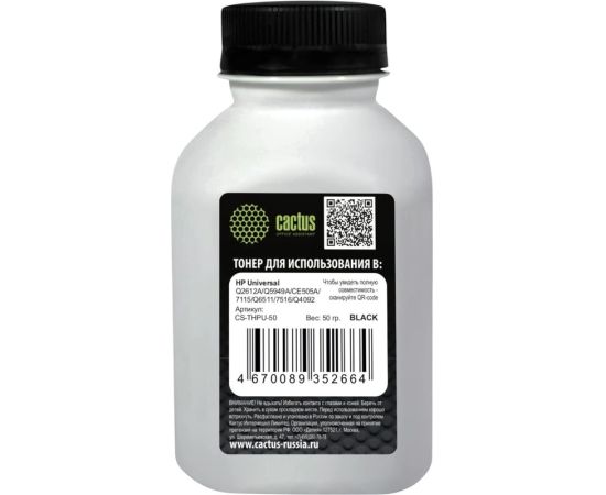 Тонер Cactus CS-THPU-50 черный флакон 50гр для принтера HP Universal Q2612A/Q5949A/CE505A/7115/Q6511/7516/Q4092