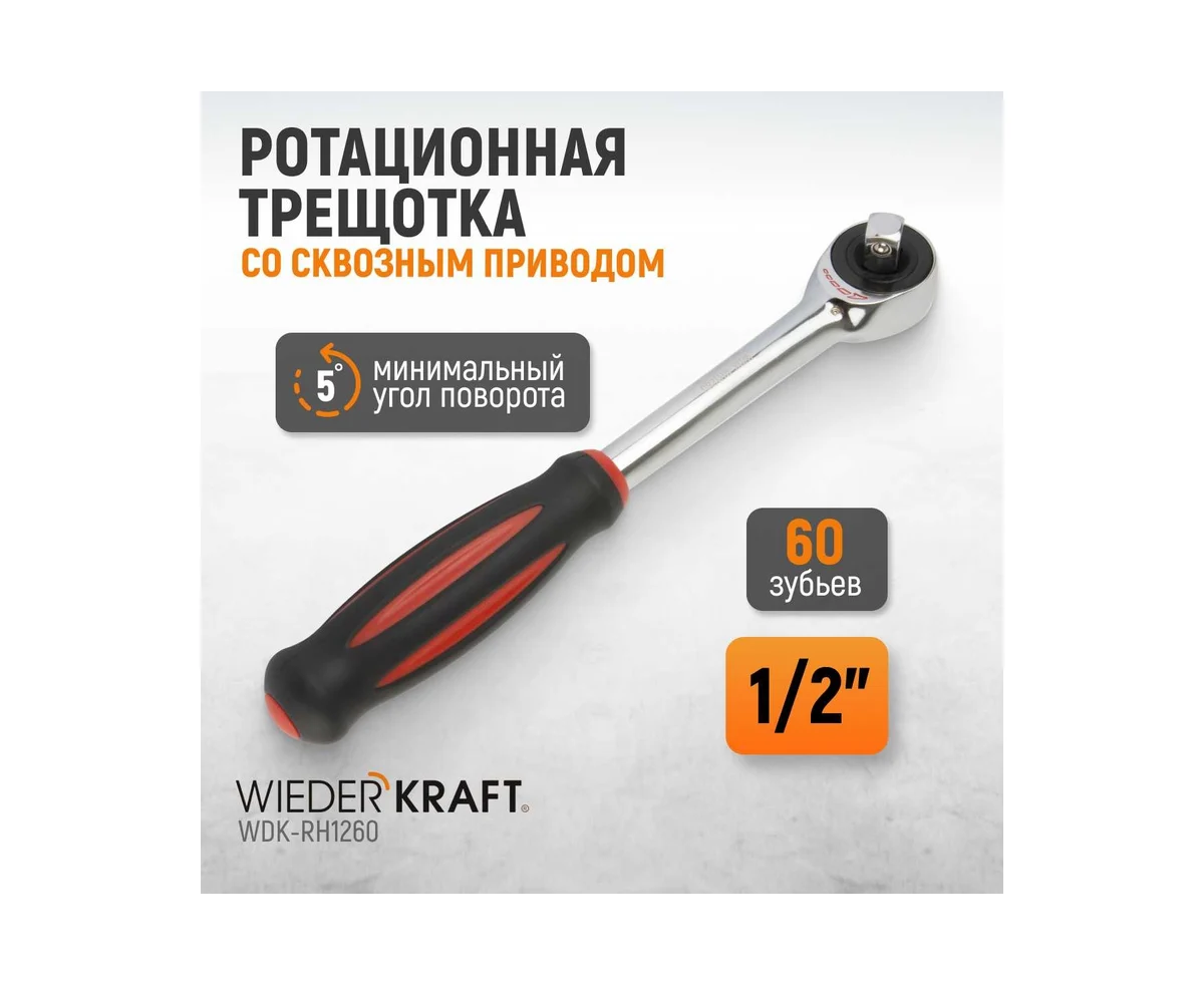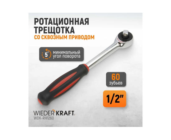 Трещотка WIEDERKRAFT WDK-RH1260 ротационная со сквозным приводом, 60 зубьев - приводной квадрат 1/2"