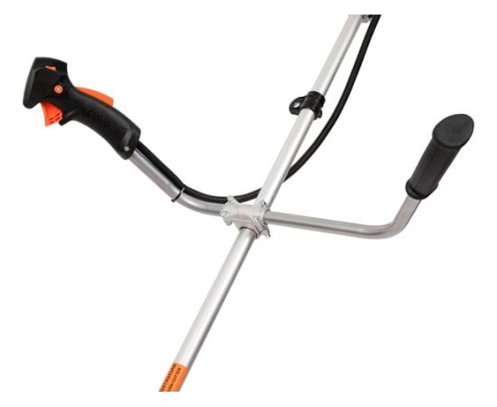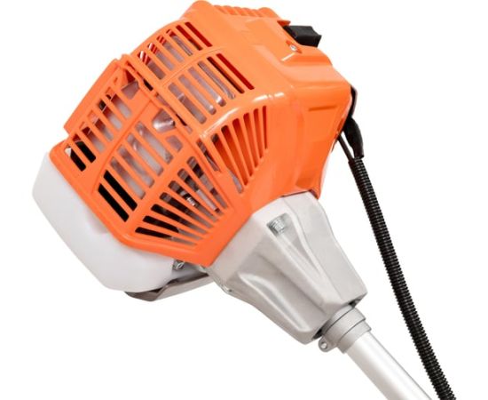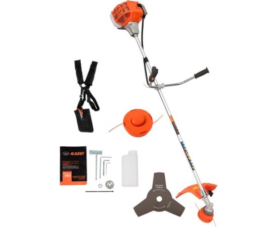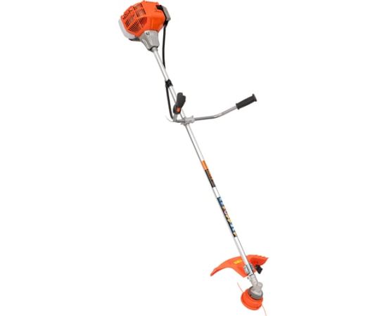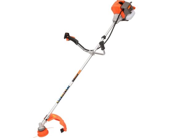 Оснащенный двухтактным двигателем с верхним расположением, он обеспечивает мощность в 1.7 лошадиных сил, что позволяет справляться с различными задачами по уходу за травой. Прямой приводной вал и U-образная велосипедная ручка обеспечивают удобство в управлении и маневренность. Триммер поддерживает использование как лески, так и диска в качестве режущих элементов, что делает его универсальным инструментом для скашивания.