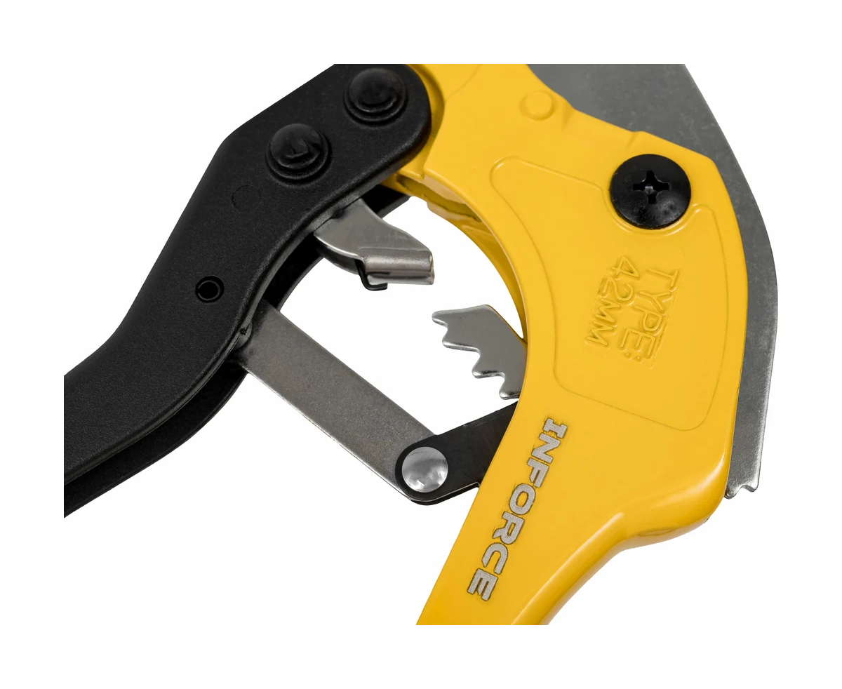 Труборез для металлопластиковых труб Inforce 42мм 06-15-10 представляет собой профессиональный инструмент, предназначенный для резки труб диаметром от 3 до 42 мм. Он оснащен храповым механизмом, который обеспечивает плавное и точное разрезание, минимизируя усилия пользователя. Резцы изготовлены из быстрорежущей стали, что гарантирует долговечность и высокую производительность при работе с металлопластиковыми трубами. Корпус выполнен из дюралюминиевого сплава, что делает инструмент легким и удобным в использовании, его вес составляет всего 0.360 кг.