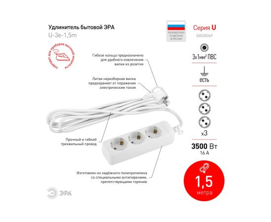 Технические характеристики ЭРА U-3e-1,5м с заземл., 3х1мм2, 16А, ПВС, 3гн, 1,5м Б0028369