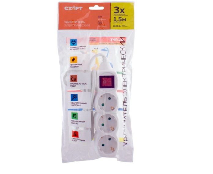Удлинитель СТАРТ 4607175852692 3 розетки С/У S 3x1-ZDV с заземлением и защитой от детей сечение провода 3х0,75мм2, длина провода 1,5м