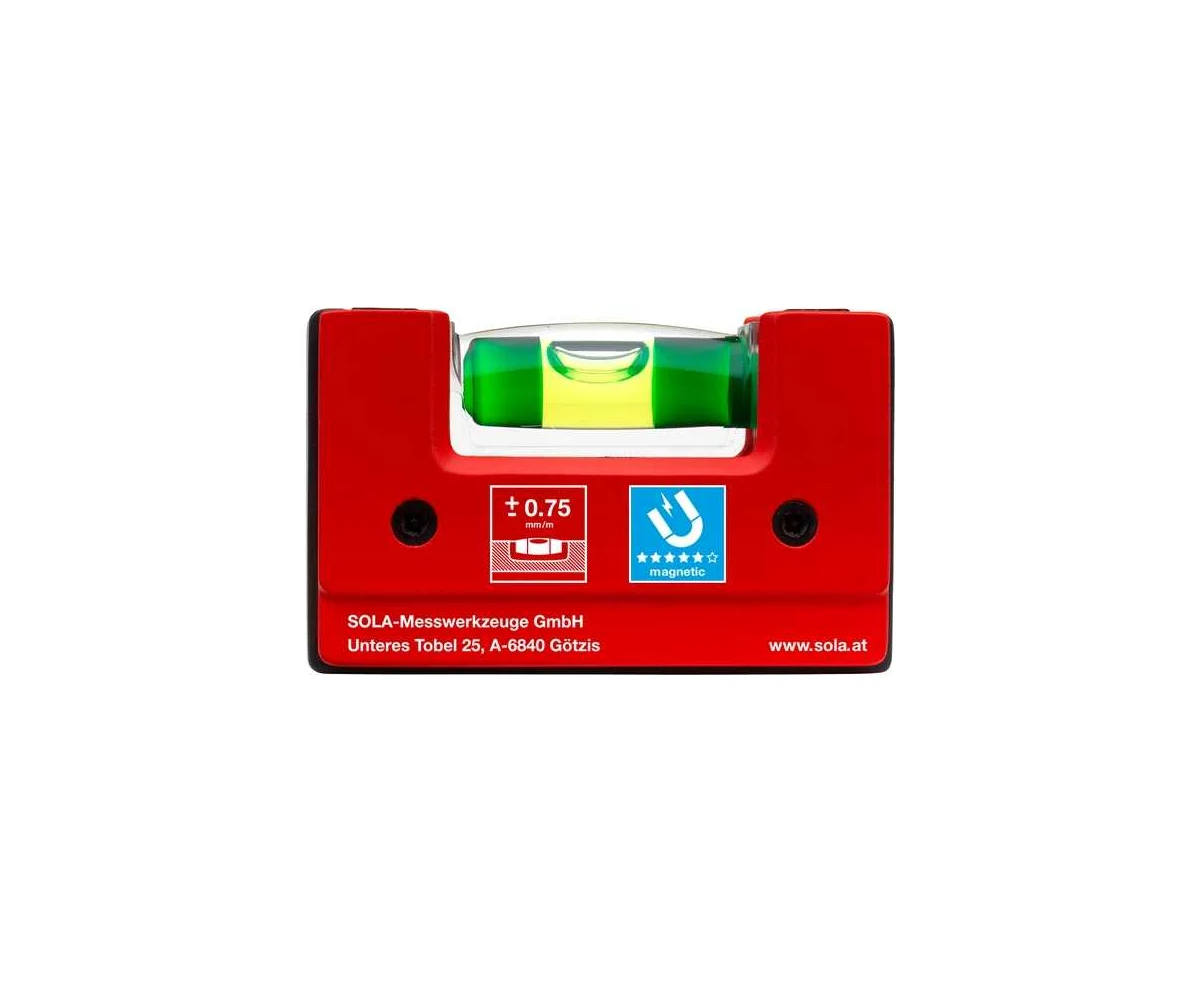 Уровень компактный магнитный GO! Magnetic SOLA позволяет определить отклонения от горизонтальной, вертикальной поверхности, а также в корпусе имеется V-образная канавка для труб. Мощные неодимовые магниты позволяют закрепить его на металлических поверхностях и производить монтаж со свободными руками. Корпус из полиамида, армированный стекловолокном, гарантирует максимальную стабильность уровня даже при падении, разрушению и деформации. Флаконы SOLA FOCUS оснащены встроенной увеличительной линзой (+60%) и обеспечивают гораздо более высокую степень контрастности. Светящееся покрытие SOLA обеспечивает улучшенную видимость даже в условиях слабого освещения. Благодаря своему практичному размеру GO! поместится в любой карман брюк и практически не займет места. Колбы изготовлены из ударопрочного акрилового стекла, на герметичность которых предоставляется гарантия 30 лет.