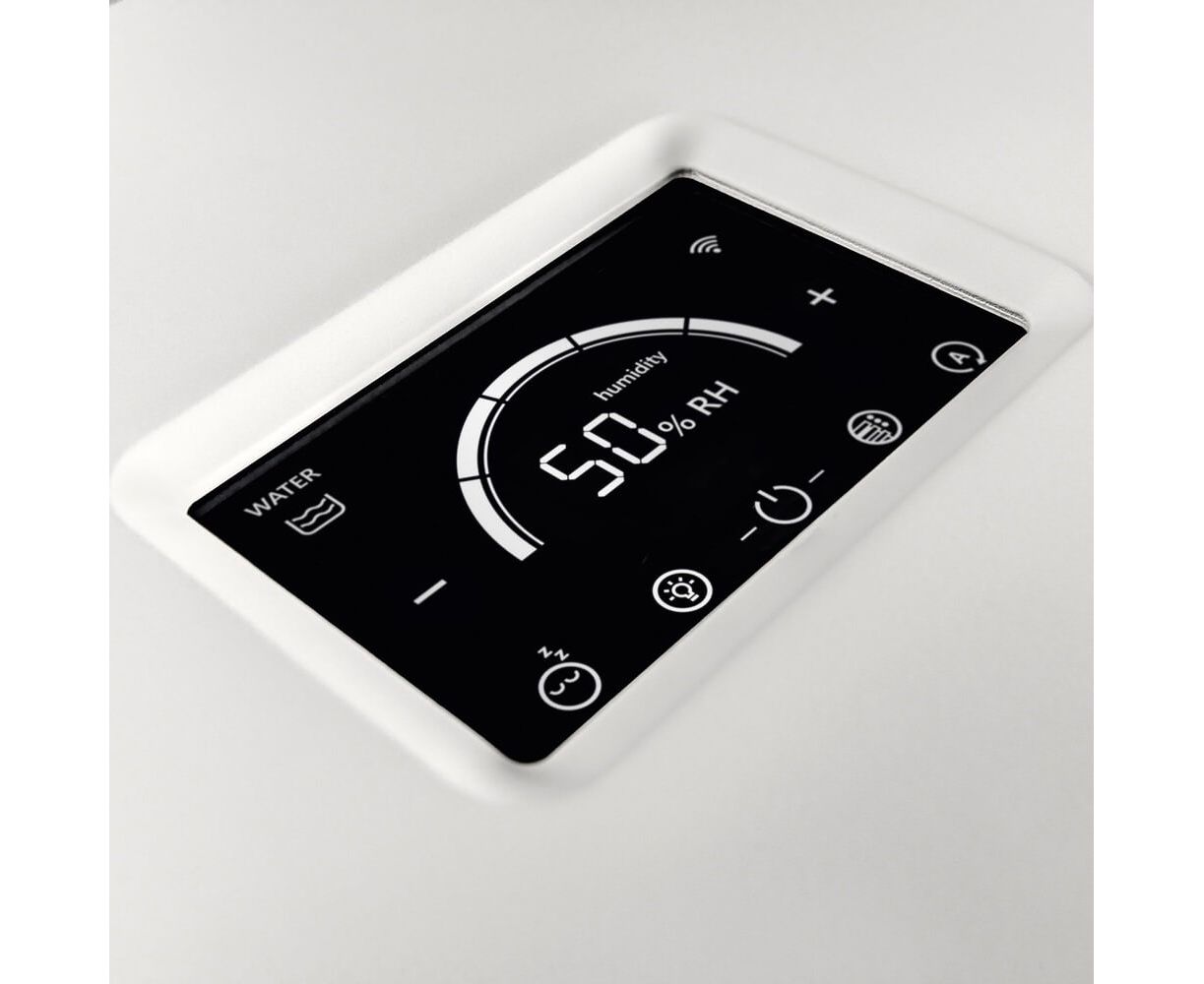 Настройки включают 5 скоростей работы вентилятора, автоматический режим с возможностью установки желаемой влажности воздуха в диапазоне от 30 до 70 % с шагом 5 %, а также ночной режим с затемнением дисплея и пониженным уровнем шума для комфортного сна