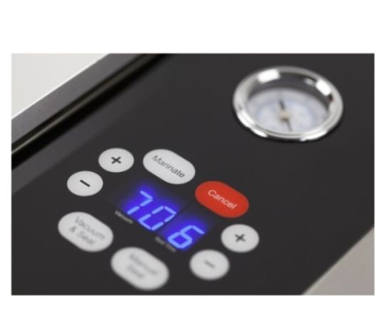 Управление прибором осуществляется с помощью панели, на которой расположены дисплей, кнопки управления и манометр. Вы можете регулировать процент вакуумирования, время запайки под себя или использовать стандартные настройки. Сварочная планка размером 30 см, шов двойной.