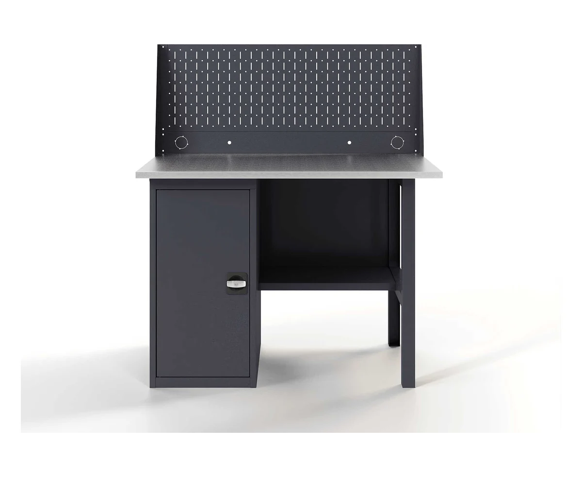 Верстак-стол - устойчивый, удобный, для слесарных, столярных работ, для производств и мастерских. Поставляется в разобранном виде. Крепкая и надежная конструкция столешницы из дерева и металла выдерживает нагрузку до 300 кг. Специальное полимерное покрытие на ножках и полке защищает от коррозии и придает столу эстетичный вид. Надежная и прочная конструкция стола , позволяет выполнять даже силовые операции с инструментом и металлоизделиями. Столешница представляет собою плиту из фанеры толщиной 24 мм, закрытую коробом из оцинкованного листа толщиной 1,2 мм. Конструкции столешницы и короба разработаны таким образом, чтобы после сборки верстака на его рабочей поверхности отсутствовали неиспользуемые отверстия для крепежных элементов, головки болтов, заклепок и т. д. Поверхность столешниц идеально ровная. Это обеспечивает дополнительный комфорт пользователю. Опора для верстаков и столов из холоднокатаной стали 1,5 мм, согнутой в П-образный профиль. Цвет серый RAL 7024. Перфорированная панель служит для размещения инструментов, крепежа и расходных материалов. Отверстия имеют диаметр 5 мм с шагом перфорации 50 мм. Перфорированная панель комплектуется дополнительной панелью для установки розеток, тумблеров и выводов компрессора.